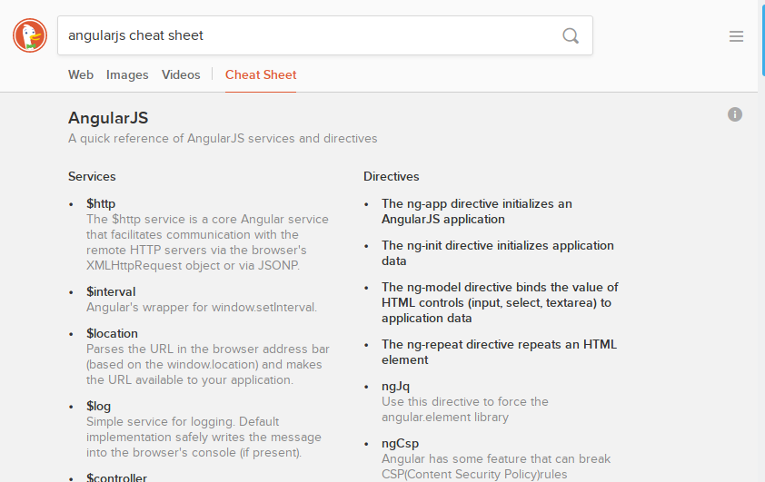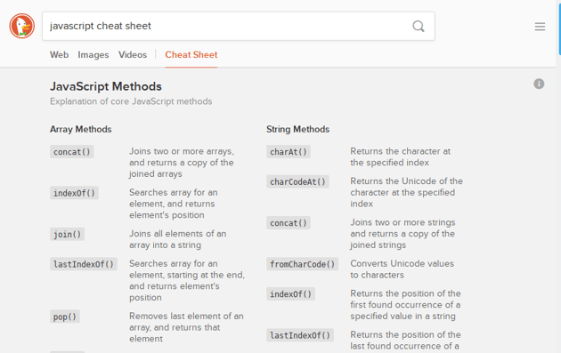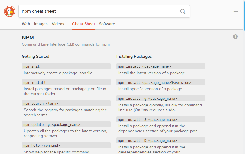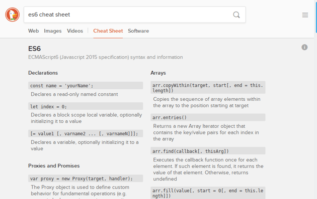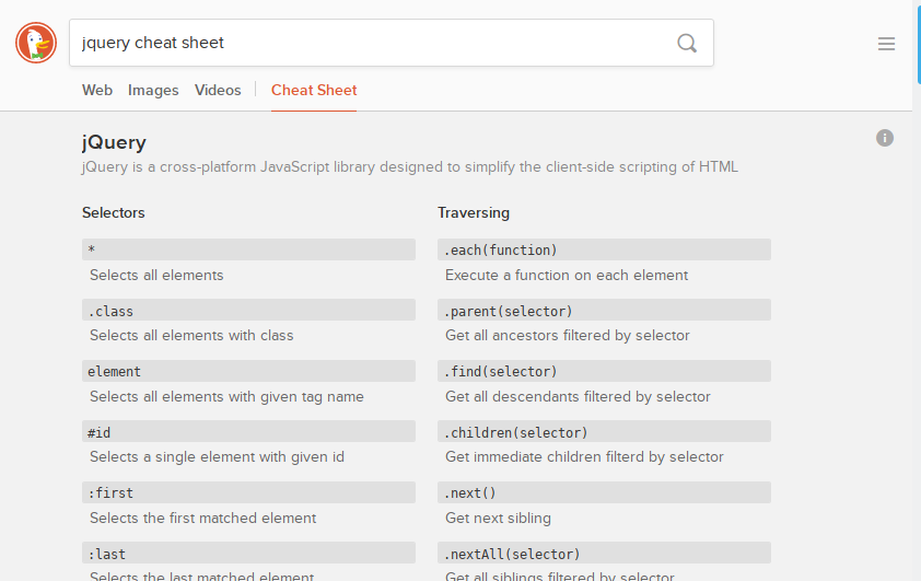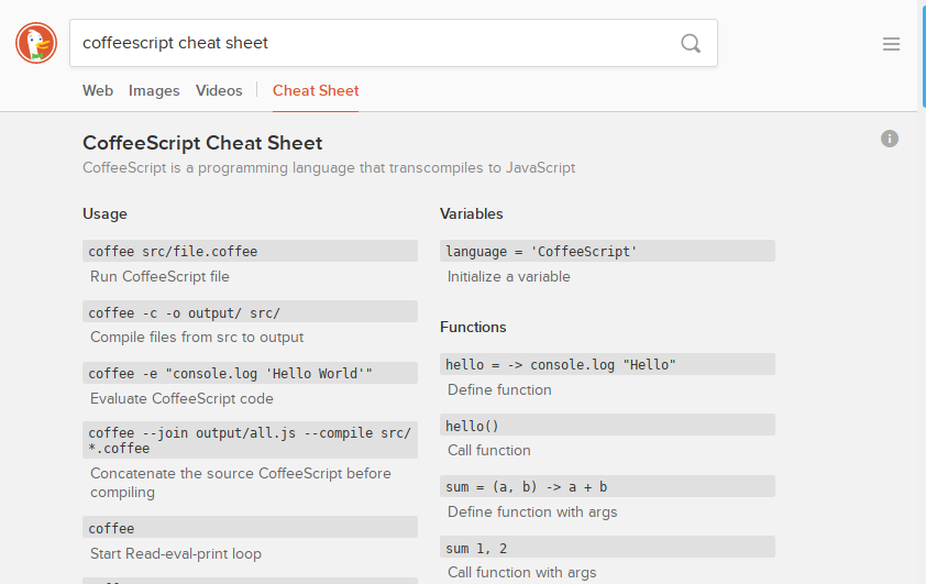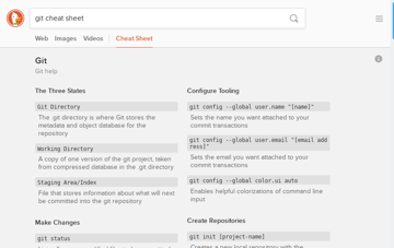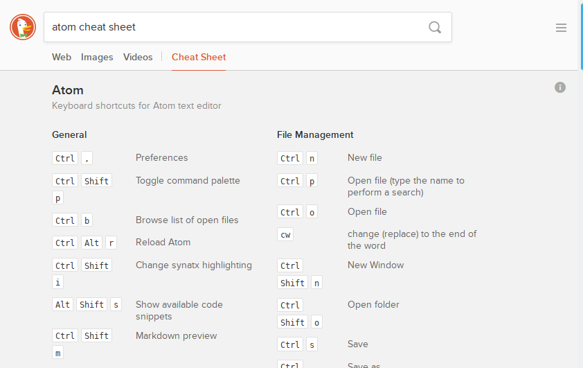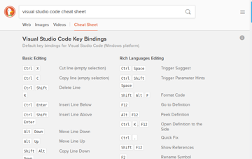 When you’re stuck and can’t remember that one little code snippet, or that keyboard shortcut in your favorite code editor, just enter <language / tool name> cheat sheet into DuckDuckGo and the chances are good you’ll immediately be presented with a cheat sheet and a rapid solution to your problem.