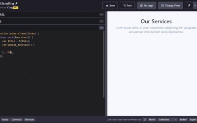 Hello and welcome back. In this lesson, we're going to create an animated effect in two different sections of our page. So the first section is up here at the top. You'll notice we have this big blank area, that's where some items are going to animate. And as soon as the page loads, but then we also wanna animate some items in whenever they scroll into views. So we're gonna scroll down on our page. And when we get down to this feature section, we want to see some more animations there. So let's talk about how to make this happen. Now, you can find the URL for the starting code pen in the course notes for this lesson. Once you open that up, go ahead and click on Fork to create a new copy and we'll get started with this new copy. So in our settings, you'll notice some basic things in our CSS. We have bootstrap, we also have font awesome, because we have a few icons that we're gonna be using. We've got JavaScript in the JavaScript tab, I should say, we've got jQuery pulled in. And that's about it for that. So in our HTML, we just have so basic HTML Bootstrap markup to set up all of our content. And in this section here, we've got a container that has few rows in it. And in these rows, we have a few cards. And so these cards are gonna be the first thing that we animate on. Now, you'll notice in our CSS that we have a few things set up here. First of all, this features section, you'll notice that we set the opacity to zero, the position to relative as you might imagine. That's gonna be one of sections that we're gonna animate on, that's why it's currently invisible, that's why the opacity is set to 0. And then if we scroll down a little bit, you'll notice that the card class inside our services section also has an opacity of 0 and position of relative. So we're looking for the card class inside the services class and we're looking for the feature class as well. So inside our HTML, in this first container here just underneath where it says our services, we've got each of these cards, okay? And you'll notice this section has a class of services. So again, if we look at this rule, we have a class of services and inside that, we're looking at each card inside those services. So we're gonna animate these cards onto the screen. And we can see very quickly what that's gonna look like. You'll notice I've created a rule for the card class that also has the animate class attached to it. And for the feature class that also has the animate class attached to it. And so as you can imagine, if I just add the animate class to one of these cards here, it should animate onto the screen. So let's talk about the animation. So we have opacity of 0, position of relative. And if we scroll down a little bit, you'll see this keyframes animation here. So if you've never used keyframes, you can do a search on tutsplus.com for animating with CSS. And specifically, we're using a keyframes animation and we've given it the name of entrance. So basically, the way this works if you've never done this before is we have some from properties and some to properties. So we're animating from in opacity of 0, to in opacity of 1, which will in effect just fade the item in. And then we're also animating the top property which is the top position. So if we set our top position to 100 pixels, that means were gonna nudge that item down 100 pixels if it's position is set to relative. So that's why we had to set the position to relative up here. So we're gonna animate that top position from 100 pixels to 0. So it's basically going to move up as it moves into place and fades in. So it's going to do two things at once. It's gonna fade in and it's gonna move into place. And so again, we've given these key frames animation a name of entrants. And you'll notice that for the card class with the animate class applied to it, we're gonna call on that entrance animation that we created down here. We're gonna set the animation-duration to half a second or 0.5s. And then we're gonna set animation-fill-mode to forwards. That way when it's done animating in, by default, if we don't set that to forwards, it's going to turn itself back off. The opacity is gonna go back to 0 after it animates in, we don't want that to happen. So if we set the animation-fill-mode to forwards, then when the animation finishes, it will stay at whatever the to state is. So the opacity will stay at 1 and the top position will stay at 0. And the great thing about this entrance animation is we're gonna use that same animation for our features section down here. And we've applied that to both the card class and the feature class if they also have a class of animate. So again, we can see what that looks like if we scroll all the way up to the top here and let's go into one of our cards here inside our services section. And where it says div class = card, excuse me, I'm also going to add a class of animate. And when we do that, we'll see that that particular item animates in. So that's good, let's get rid of that. So what we're gonna do is in our JavaScript, we're gonna cause this to animate. We're gonna add that class in JavaScript to our cards to get them to animate in, and we'll talk about how to do that in just a second. But let's scroll down one section we haven't looked at yet is the our features section. So let's just scroll down and take a quick look at that. It's set up very similarly to our first section. So there's our commitment and here's our features right here. So in our features class, we have this section called features, inside that, we have a number of divs with a class of feature. And these are the divs that we're going to apply that class to as well. And we'll see what that looks like after we create that animation. So let's get started. There's really not a whole lot to do here. We have a section here and a section at the bottom. Each of these sections has multiple items in it. And I don't want them all to animate on at the same time cuz that'll be kinda borin