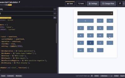 Hello, and welcome back. In this lesson, we're gonna get started creating a calculator that we're gonna create all the functionality for it using JavaScript and jQuery. Now, the calculator itself was built in simple HTML. We're just using some Bootstrap markup here to lay everything out. It's pretty straightforward layout, you can look through that to see how that is structured. One thing I will point out is that some of these items, let's stretch this out a little bit so we can read it a little better. Some of these items have specific classes or data attributes on it that we need to pay attention to. For example, the plus, minus, times and divided by buttons all have a attribute called data operation. And we're gonna be using that to determine what operations we're gonna be applying on our calculations. So the data operation for this one is set to divide, this one is set to multiply, etc., etc. We also have some items that say data-type="number". This is gonna represent all of our numbers and the decimal point. Everything else, we can kind of look at our JavaScript to see what we've got, cuz I've already created some variables here to point to all of our buttons. And this can give us a really quick overview of what we're looking at. So let's take a closer look at that. First of all, I'm gonna go and point out, you can find the URL for this particular CodePen in the course notes for this lesson. And this will be the CodePen we're starting from. And we've got a few variables defined, we've got some operations here, which define ADD, SUBTRACT, MULTIPLY, DIVIDE. And you'll notice these ultimately end up being strings, but we access those strings by typing something like operations.ADD. And this will be the same thing as just typing in the word ADD as a string. The reason I set it up like this is because if we accidentally misspelled add, let's say we put three Ds instead of two, then it would actually throw an error for us. Whereas if we just mistyped it as a string and did three Ds that way, it wouldn't throw any errors and it might be harder to debug. So setting it up like this just makes it a little bit easier to maintain the code and debug it if we need to. Same thing with numbers, for the numbers, we're keeping track of two different numbers. Because at any point in time we're entering in a new number while we're also keeping track of the current total. So we have the total sitting there in the background and then the current numbers, whatever number we're currently typing in. There's one exception, is when we first start typing, let's say that our window initially loads and we start punching in the numbers for our first number. At that point, we're editing the total and not the current number. Because whatever we enter there is going to be the current running total until we add something to it or multiply something by it, etc., etc. So this will help us keep track of what number we're currently editing, whether we're editing the total number or the current number. And we'll see more about that as we move forward. Then we have a few variables here to keep track of our numbers. So this is the total. Right now, all of these are set to undefined because we don't have a total or a current number yet. So these will store the actual values that we're punching in. This up here is simply meant to keep track of which number we're currently editing. So the actual numbers are gonna be stored in these variables. So we have our total, our current number, which is whatever number we're currently typing in, and then we have our operation. So if we clicked on the minus sign, then the operation is gonna be set to operations.SUBTRACT or just SUBTRACT as a string. We also have this startNew variable, which we'll get into a little bit later on. But this determines whether we are, when I click the 7 here, it determines whether we're starting a new number or whether we're appending this to the end of the number we're currently editing. So if startNew is set to true, then when we click any number here, it's simply going to replace everything in the input field up here at the top. But if startNew is set to false, then when we hit a key on the calculator here, it's going to append that number to the end of the existing number. And then we have this editing variable, which is where we're keeping track of which number we're currently editing. And right now, it's set to numbers.TOTAL. Because remember, as I mentioned, when we first start punching in numbers when our page first loads, that number is going to be the total. But as soon as we hit plus and then start entering in another number, that next number is going to be numbers.current. So this helps us to keep track of that. And we'll see why it's important to keep track of that later on. But then we have all of our number, all of our variables here, excuse me. And you'll notice all of these start with a $ sign because they're all pointing to jQuery objects. And so the btnOperation variable is pointing to all objects that have a data attribute of data-operation. Now remember, that's gonna be our plus, minus, times, and divided by, it's gonna be those four numbers, or those four buttons, excuse me. And when we click on one of those, that will store in this operation variable which operation we're currently trying to work out. Then we have btnNumber, which stores or which references any item that has a data-type attribute set equal to number. And that's gonna be the number 0 through 9 and this decimal point. This does not include the plus, minus, that's gonna be its own little creature. But all of these, again, 0 through 9 plus the decimal point, those are all set to a data-type of number. btnClear is simply the item within ID if btn-clear, which is our C button up here at the top left. That will clear all of our numbers, our total, our current number, and our operation if there is one. The btnEquals sign is gonna be the equals sign down here at the bottom right