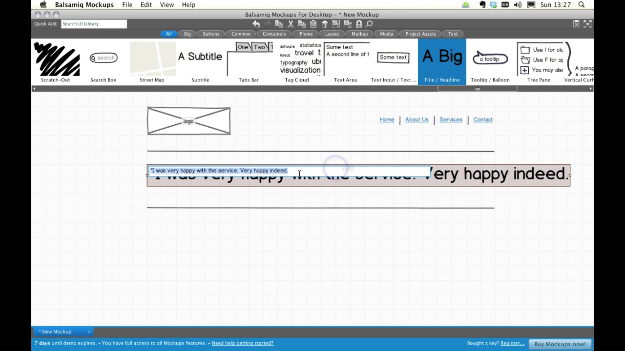 Of course, you can do your mocking up using all manner of available tools. There are templates for Photoshop, Illustrator, Fireworks, UI kits which can help you lay out web site elements quickly and edit them just as quickly if you need to. We’re now going to take a quick look at Balsamiq, a Flash-based rapid wireframing application, it comes in desktop or browser flavors, and it demonstrates perfectly how we can quickly pull together a wireframe. It’s not free unfortunately, but you can easily make use of the demo version, as I’ll show you now.