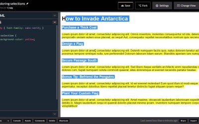 Hello and welcome back. By default, whenever you highlight a section of text on a website, your text is going to turn white with a blue background and the shade of blue might vary a little bit depending on what browser you're using. But for the most part you're stuck with blue and white. Well in this lesson I wanna talk about how we can use CSS to change that. And we're gonna change that using the selection pseudo class in CSS. So you can find the URL for our starting pen in the course notes for this lesson. And once you open that up go ahead and click on Fork to create a new copy. With this new copy we'll jump into our CSS and get started. So we have an h1 at the top and then a serious of h3 followed by paragraphs. Pretty much the same HTML we've been using in the last couple of lessons. So let's jump into our CSS and let's skip a couple of lines. And let's point to our paragraph. If we want to change the background color of our text whenever we highlight it we need to use the selection pseudo class in CSS. And we can do that very simply by typing ::selection, and then inside parenthesis we can define our rule. So here all I really wanna do is to change the background color to a different color. Let's just change it to yellow. So when we do that, you'll notice that when we highlight, all of our paragraphs now are highlighted in yellow, instead of blue. And you'll notice another very interesting thing, is that our browser can tell what color the text needs to be based on what color the background is. You'll notice that our blue background on the default selections has white text behind it but when we highlight it with a yellow background, you'll see that our text stays black so it's still easy to read. Now, you can change the text color if you want to. If we go back into our rule here, we can change our color to white and then highlight it, and you'll see it becomes much more difficult to read. So if you don't like the default color of your texts whenever you highlight it, you can certainly change that. We're just gonna leave that at its default, so it will go back to black. So then we can have a little fun with this, and make it really stand out, by giving our h3s and h1s different selection colors. So if we point to our h3::selected, we can give it a background color of orange, and then for our h1s ones we'll use the selected pseudoclass again and give it, I'm sorry not selected should be selection. We'll use that selection pseudo class to give our background color for our h1s, if we can spell that right, a value of red. So now if I were to highlight the whole page, you'll see that each different element has a different highlight color. And that's how you can change the background color of your text whenever you select it using CSS. Thank you for watching and I'll see you in the next lesson.