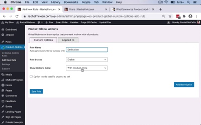 Hello and welcome back to this Tuts+ course of getting started with WooCommerce. We've now set up our store and added some products to it, but now I want to add some extra functionality. Because one of the things that I will be selling is signed copies of books, I want to add a field where people can request an inscription. So when I sign the book, I can also write something to them. Now WooCommerce doesn't allow for that out of the box, so I'm gonna need to install an add on. And I'm gonna install this WooCommerce product add-ons plugin from Code Canyon. So this gives you access to a whole bunch of different add-ons for products, including text fields, but it also lets you add more variable aspects of your products. It lets you add images for those, it lets you add check boxes, radio buttons, all sorts of things, but what I'm after is those text boxes. So I'm gonna buy this plugin, I'm gonna download it, and then I'm gonna upload it to my site. And then we'll start adding those custom fields. So I'm now back on my site, and I'm gonna upload and install that plugin. So I'll go to Plugins > Add New and then I'm gonna upload the zip file that I downloaded from the Code Canyon website. So there's the zip file, I'll open that, I'll install it. And again, because I'm working in a multi site network, I'm having to install this in my multi site installation. And then I'll go back to this site and I'll activate the plugin there. If you're using a standard site, you'd install it and activate it in the same place. So here it is, WooCommerce Product Add-ons, I'll activate that. So now I can create product addons via this Product Addon menu. So I click on Add New to add a new rule. I'm gonna give it a name, Dedication. And the price of the option will go with the product price but it's gonna be free and I will enable it. Now, if I wanted to, I could just apply that to specific products or specific categories. But I don't want to, I want to apply to all the products in my store. So I will click Add New Option, and then I get to select what type of option it is. So I want the text area, I don't want it to be required. And there's no conditional logic. Price is 0. And I'm gonna make it ultra clear and then I'll save the rule. So let's take a look at the Applied to and I'm gonna add it to all the categories. So that's quicker than adding it to all the products. So now let's take a look back at this product and refresh. So if you want to buy that, you have to add the dedication here. And then, here we have the dedication, so now let's view the cart. And here it says what that dedication is and we've got the cost of the book, the shipping of flat rate, which we've already calculated. And then we can go to the check out and make that purchase. So now when I receive that order, I will get a note of the shop owner of what that person has asked for as the dedication in the book. So I can then sign it before I send it out and I can write what they want me to in it. So that's how you add the WooCommerce product add-ons plugin into your store and use it to create additional fields for use in the checkout process. In the next part of the course, we're going to wrap up by summarizing what you've learned as you've worked through this course. See you next time and thanks for watching.