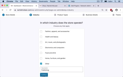 Hello, and welcome back this tuts plus course on WooCommerce. In this part of the course, I'm going to start the process of setting up our store. So I'm gonna install WooCommerce and work through the wizard to get it working. First, let me give you a quick tour of the site I'm gonna do this on. Instead of using a demo site, I'm gonna use a real site. I'm gonna use a site for an author, and it's actually myself as a pen name. So at the moment, this site has got a shop page, which has just got a form in it so people can order copies of books using this form. Now, that's got me a few orders but it's not brilliant. It's not got photos of the books. It's not got any variants and books that people can't choose whether to buy a paperback or an E-book or a hardback if those were available. And it probably isn't helping the sales of those books very much. So instead, I'm gonna set up WooCommerce and replace this shop page with a new shop page using WooCommerce this functionality. Now this particular site is actually part of a multi site network. So I'm gonna have to install the WooCommerce plugin on the network, and then activate it for the site. So this process will be exactly the same if you're running a regular single WordPress site, you'll just install it for the site itself instead of the network. So I'm gonna go to the network dashboard here and go to plugins, add new. And then we'll probably find WooCommerce No, it's not there. I'm gonna search for it. Here we are so install now. Now if you're installing this on a regular site, this install button will turn into an Activate button. In my case, it's gonna turn into a Network Activate button. So I will be activating it on every site in the network. And I don't want to do that. So I'm not gonna click the Activate button when it kicks in, but instead, I'll go to the site itself. So you see here it's Network Activate. If you're running a regular site that will say activate, and you can just click that button to activate WooCommerce in your site. And that will then take you to the WooCommerce wizard automatically. But instead, I'm going to go back to my site, go to plugins. And then I'll scroll down to WooCommerce and Activate. So WooCommerce will activate and the wizard will start. So you've got the choice of using the wizard if you want to, you could click Not right now if you're not ready and come back to the settings screens later on, but I'm going to click Yes, please Now you'll find that the settings that you need to use for your store are obviously different to mine. I'm gonna be setting up my store in the UK, and there'll be some information that's pre populated based on what's already in my WordPress site. And you might have to add more information if it's not being pre populated. So, I'm going to start by putting my address in. I'm going to start by putting my address in and I'm not going to give you my real address but it's no big surprise that I live in Birmingham. Click Continue. All right doesn't line up. Click Continue. And then if you want to, you can take part in usage tracking, click count me in. Continue again. And then it'll start asking you some questions. So just work through the wizard, doing what the plugin tells you to do at different stages. So I am in other I will have physical products, I will have downloads and I might decide to have subscriptions and memberships later on. But you need to pay for an add on to enable that. So I'm not gonna do that just yet. So I click Continue. How many products do I plan to display? Under 100 but over 10. I'm selling on another platform because my books are also for sale on Amazon and in Waterstones and other places. My current annual revenue, I'm gonna say just getting started cuz I'm just getting started with this store and the store is using Amazon. Because I'm going to include in this external product and I'll send buyers to Amazon with affiliate links for some of my products. Now you can then choose to include Facebook Mailchimp, Google ads. Now, I'm not gonna worry about Facebook or Google ads, but I am gonna include Mailchimp because I want to connect my customers to my mailing list which I run on Mailchimp. I Click Continue. And you can see here the continue button is showing a graphic. So now I can choose a theme, now Here I have to select a theme. You can see there are a whole load of choices. There are free themes here. And you can find all these in the WordPress theme directory as well. I'm gonna stick with storefront and once I've set this up, I'll actually revert to my existing theme. Now I think this is actually a downside of the wizard because it doesn't give me the option to stick with my site's existing theme. Yes, you've got the option to upload a theme. I don't want to upload a theme cuz I've already got a theme installed on my site. So, I'm going to choose Storefront here because I've already got Storefront installed on my network. And, It's been activated. So I'm going straight over to the appearance the themes page, and I'm gonna activate my existing theme. Now, it did very briefly show me a button where I could continue with my existing theme. And then that disappeared. So it's important to go into your themes and do that quickly. If it's important that you're site maintains its existing theme. So here I can enhance my store with Jetpack and WooCommerce Services. So I can do things like manage my store on the go by the WordPress app. I can automate my sales taxes and I get all the benefits of Jetpack speed and security features. So. Do that. I've already got Jetpack installed on my site. So I'll click yes please and that will install the WooCommerce Services plugin. So I'll just wait for that to happen. And WooCommerce is telling me I'm almost done, and asking me to continue. So I need to update the Database. And every time you install or update WooCommerce in the future when it has an update, you'll find that you're prompted to update the database. And that's
