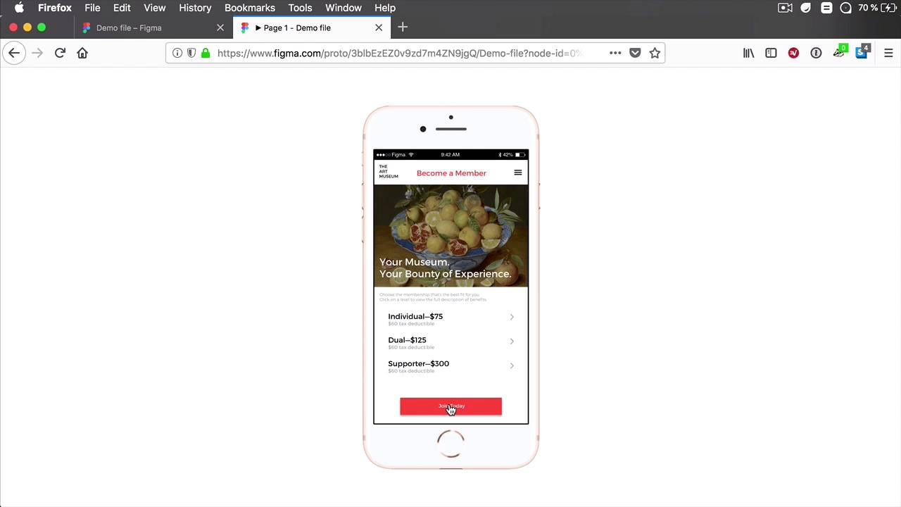 When prototyping, adding the links into external websites will simply add to the realism of that experience. And fortunately, Figma has a feature that allows us to do exactly that. So let's check it out. Let's say that on this last membership frame, when we click the Join Today button, we wanna be taken to a website. Let's say, Envato.com, right? So what I can do is I can select the button, and under Destination, I have a drop down, and I have a couple of options here. One, I can choose from the other frames that are in my document. And you can do this instead of manually clicking on that circle and dragging an arrow to that frame. Or I can select Link to URL, and this will link to an external URL. Let's say www.envato.com. That should be enough. So now when we go to present, and we go all the way to the last frame, we click the Join Today button, And it's gonna open up Envato.com. It's a redirect basically and it opens up that external website. So again, simply select your elements, and you need to work with the Destination panel. Select Link to URL, put in your link, and you're all set. And that's quite a handy feature, even if you won't use it all the time. It's always good to have it there just in case. And it certainly adds to the whole realism of the experience of prototyping. And remember, this is basically just a design, right? It's a static product, but with prototyping, you can almost make it feel like it's a live coded project. You can jump in between different pages. You can add links to external websites, just like you saw here, so it really makes for a great experience. Now another recent edition to Figma Prototyping is the ability to create hotspots to the previous frames. I'll quickly show you how to do that in the next lesson.