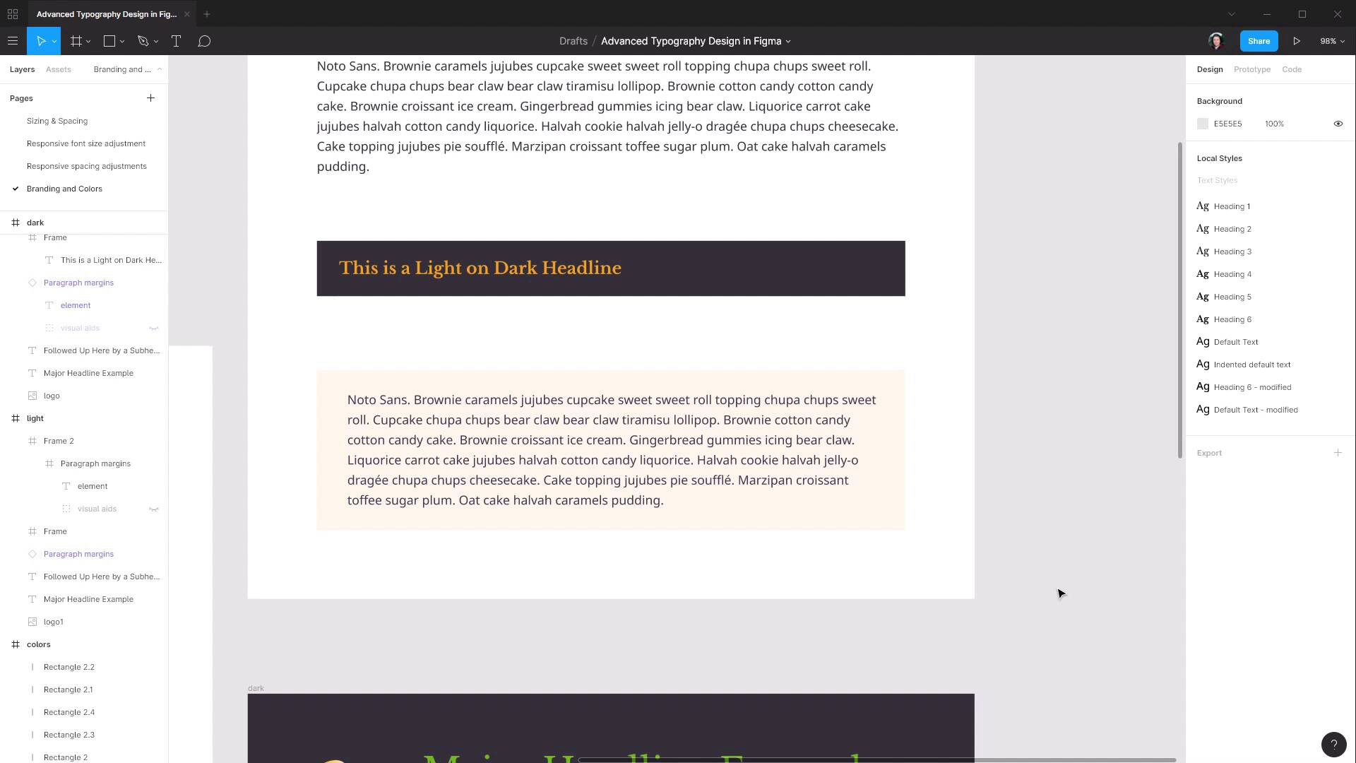 Hey, welcome back to advanced typography in Figma. In this lesson, we're carrying on with a look at color in your typography. And we're moving into the relevance of color to accessibility. The first place that we're gonna look is how color contrast should be evaluated as part of your design process. And there's actually a really helpful plugin that's free that you can use with Figma that basically automates the entire process of checking on color contrast. So head up to your Menu > Plugins > Manage Plugins. From here, hit browse, and then just search for color contrast. And you'll see here Color Contrast Checker. So that's the one you want to go ahead and install. And then the way that this plugin works is you select any frame in your design. So let's start by selecting this frame here with that paragraph. You go up to the Menu > Plugins > Color Contrast Checker and now, you just press the Check button. And what it's gonna do is look at the color of the text and the color of the background here and compare them and tell you whether or not they contrast well enough. So we just hit Check and that tells us that it meets the triple A color contrast requirements. And there's two grades, well three grades, rather, that your color contrast can have. There's two passing grades, double A and triple A. And then anything lower than that is, basically, a fail. That means that your color contrast is going to cause reading issues for somebody. So I'll give you an example. If I select this text and then I make it lighter, let's move this out of the way. Actually just close that. If I make it lighter, I'll just make it ridiculously light to get the point across. And then I run the checker again. I'll press Check now. Now you can see that it's alerted us to the fact that the color contrast is no good. This is too difficult to read. These colors are too close together. To have enough contrast means that your colors have to be far enough apart in lightness. You need to have one that's quite light, and one that's quite dark. Now what you can do to correct your colors, is you can move either one of these sliders. So this slider controls the color of the text, so I can drag it down to make it darker. And you can see this number here, is showing you the contrast ratio. And what you wanna do is change the contrast ratio until both of these values here, these gradings, double A, and triple A, turn into a tick instead of a cross. So I can keep dragging this down. So there's our first passing grade, double A. But that is still gonna cause some reading difficulties for some people, just fewer people. Or I can keep dragging it even further. Now, we have both of them at a passing grade. So I can, if I want, I can just try to fine tune this so I get it just over the mark. And then if I hit Done, that's gonna allow me to keep those colors. So those sliders are really useful if you know that you already have a selection of colors that you really like and you don't wanna change them too dramatically. Just wanna tweak them a little bit so that you can get to that passing grade for your color contrast. So we already had good colors there, so I'm just going to undo to get those good colors back. So that's what you can do, you can go through and select each one of the frames in your design. I can select this one here, and then just repeat the process. So Color Contrast Checker, Check, triple A amazing, so that one's all good. And then I just wanna show you one of the gotchas that you can get when you're using this plugin. Sometimes the plugin might not be able to tell exactly which backgrounds are related to which foregrounds. So if I select this whole frame, it's going to give me a warning, because it's going to detect this yellow headline color here. And it's gonna think that it's being used on top of a white background. So I'll show you that Plugins > Color Contrast Checker, Check. So it's said that everything else here is fine. And it hasn't flagged any of our other colors, but it has identified this yellow color. So if you do see an error like this and you're not sure which element it applies to, then either you can just check visually. You see a yellow color there so you know this is your only yellow color on the page. You've already checked that frame individually, so you know that it's fine. Or you can just start moving one of the sliders and seeing which one of the elements is modified when you change that slider. Then you can hit reset to put it back how it was or, obviously, you can just hit undo. It's for this reason that it's a good idea to group things up into individual frames. So for example, if I want to check and make sure that the color contrast of this area is okay, I'll grab the frame tool and I'll just draw a frame around all of these. And it's going to automatically nest all of these items inside this frame. So you can see that this frame is frame three in the layers area here. And then all of these elements have been nested inside. So now I can check those elements individually. And verified that they have a passing grade on their contrast as well. And I have already gone through and checked all of these colors to make sure that their contrast is adequate. That was part of my color selection process. So probably what will actually happen in practice is you'll create a selection of colors here that'll look good here. But then once you go through, apply them to your text and run the color contrast checker on them. You'll probably find that you need to tweak a couple of them just a little bit before you fully settle on using them. So that is how you check color contrast in Figma. And that's one of two main color considerations that you always need to bear in mind when you are ensuring your topography is designed for accessibility. The other is color blindness. Now you might think that checking for color blindness could be a difficult process. But once again, thanks to a plugin that's freely available for