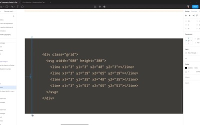 Hey, welcome to the last lesson in advanced typographic design in Figma, we're going to design one more specific element in this typography. And that is gonna be a pre formatted code block, which in HTML is the pre element PRE. So as we have our block quote, the first thing that we're going to need is a frame. So we'll just try to frame it's gonna be a usual 850 pixels wide, and we're gonna make this one 350 pixels high, and then centered. Then we're going to add in a text box, just a random size, we'll tweak this later, and we're gonna paste in a bit of code. This code will be in a text file in with your source files ready for you to copy and paste into this document. As usual, in Figma is gonna hold on to whatever font styling you're using in your most recently patched text item, so that was this. So let's just clean this up a little bit, first set it to be left aligned, that makes it a lot easier to see what we're working with. Now we're going to apply a font family, now if you remember from the last course, we went through an example of setting up a bunch of font stacks. And in that example, we chose the Inconsolata font for our Monospaced font. And when you're doing pre-formatted code block, a pre-element, you want to use a Monospaced font so that It looks like card basically. So we're gonna go into our font list here and start typing, Inconsolata, there we go, much like more proper code. It doesn't need to be as big as the text that we were using before. We're gonna bring the font size down to 18 pixels, that would be just fine. And now let's just bring up the size of this text box, that it's the right height, and now we're gonna start coloring. This vertically align the frame to start with, now we're gonna do something that will be an inverse of our block quite style so that it's really obvious that these are two different things. So we'll select a frame and for the background, this one here, instead of using a light color, we're going to select it, but then we're going to take it down so that it's darker. And then across the lift so that it's got a bit less color to it, and we're gonna choose a dark brown. We want it to be almost grey, so somewhere around here, a brownish gray blend. And the exact color that I ended up with this is 42403b, and now for the code, we're going to use a version of a light color. So that's already pretty close as it is, but I think that in order to make it a little bit more vivid, we're gonna just slightly tweak this color, So that it's a bit richer. So we're gonna drag this color picker over to the right, and just increase the amount of our yellow hue, yellowish-orangeish hue that we have in it. So we get to that there, and for this I ended up with the color code FFE5BBD. Now that's already looking pretty good, that's already looking like a nice decorative code example. And we're gonna just bring this in from the left a little bit, it's a little bit plane. So to help make it jump out a little bit more, I'm just gonna run a line, then left side of this box. So grab our pen tool, and we're just gonna click up the top hold Shift to lock it into a straight line, and then click down at the bottom. And then so you don't have this extra shape dragging off the end, we hit Enter to complete that shape, and now we just need to tweak the ends. Just drag each one of these ends out while holding Shift to keep their lines straight, to make sure that they cover the whole height of our box here. Hold down Ctrl to directly select it, now we're gonna increase the width of our line up to, I think about four, looks right? I'm gonna put over on the left here, four pixels from the edge roughly. So we've got about the same size gap as we have width on our line. And now we want a color on this lines that's gonna match our text, roughly speaking. So that looks pretty cool, but that's a bit too bright. One of the things that forms a part in designing typography is making sure that the elements surrounding the typography don't distract from it too much. So we're just gonna pull some of the color out of that strip, and we'll get that down to a more subdued, less saturated version of this yellow. And for me, the color that I chose ended up being BDB49C. All right, so there we go, there's is our pre-formatted code block for a lite version. And as usual, we're going to do the same thing on our dark version. So I've just copied the whole frame, hold down Ctrl and click to select this frame, and then paste, and that brings in our code here. And we're gonna go with a light on doc block here as well, but we don't wanna have those yellow tones. Again, we wanna shift this over to the purple, hues that we're using a doc design. So for the background color, I'm gonna start by just selecting a main area background color, so we'll just go with that. And then we're just gonna bring it up enough that there's a contrast with the background. So about there will do, the code that I used on this is 4F485A, for our text, we select that. We're gonna go with almost white, but not quiet white, we're gonna have a little bit of purple in it. So let's select this purple and then we're gonna drag the slide up all the way up to the top here. If you watch the hex code, change over here, you see that if you get all the way to the top, anywhere from left to right is gonna become pure white. But if you just a little bit down from it, then it's going to give you some of the purple in your color. So, we're gonna go just a little bit down from the top, and my final hex code for this one was FBFAFD. And then the last thing to do is just change up the color of this line here. Now this one if we went with pretty much any type of a light color, it's gonna look too distracting even if you turn that down, it's still gonna look pretty distracting. So we're actually gonna go with a really dark color. We're gonna bring this all the way down, To about here we're going to leave a little purple in it, but not too much. It's 