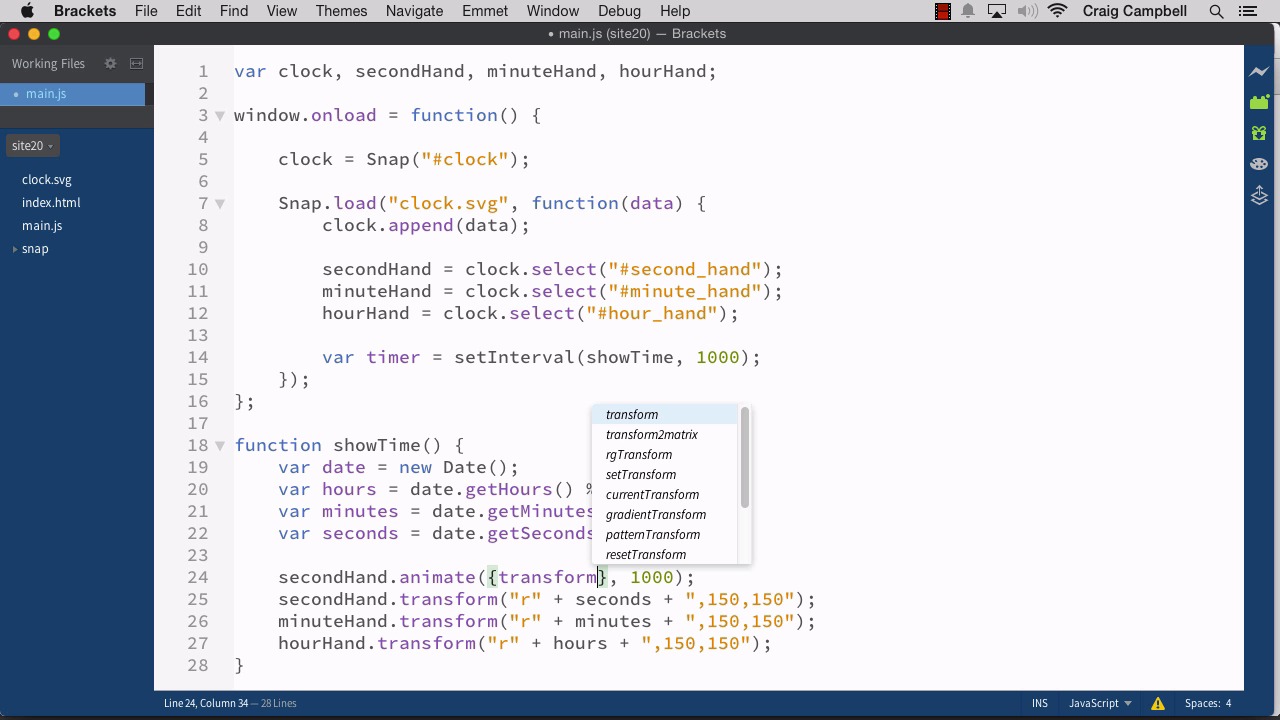 Hello, and welcome back to animating with Snap SVG. Now that we've got our set interval function working so that we're constantly refreshing our SVG to reflect the current time, let's actually make this a little bit smoother and turn it into an animation. After all, that's what this course is all about is animating with Snap SVG, so let's make that happen. I'm gonna grab the site 19 folder, copy and paste it. and we'll rename it to site20, and all of our changes in this lesson will be saved there, so let's drag that down to brackets and open it up. And now we've got our main JS file opened up here. So, again, we've got this set interval function running, which is running the showTime function over and over again every 1000 milliseconds or once per second. So now instead of just transforming our secondHand, we want to animate it. So instead of secondHand.transform, I'm gonna do a secondHand.animate. So inside our animate function, we need to include a pair of curly brackets there, and then the duration of our animation, which is going to be 1,000 milliseconds because we want this to happen once a second. And we want our second hand to be constantly moving at a constant rate of speed. So if that animation takes one second, and it recurs every one second, then ideally our second hand would just be constantly moving. So now inside the curly brackets here, we need to create that rotation. So we're going to do a transform: space, and then our transformation string, which we already have down here for our secondHand.transforms. So we're just gonna grab this here, copy it, and I'll paste it inside those curly brackets. So let's get rid of this line of code we no longer need that because we're now animating it instead of just moving it. So let's save that and see if it works I'm gonna jump back into our browser. And we're gonna navigate to the site20 folder to index.html, and let's see if that works. So, first of all, you see a very quick animation where everything's getting into place where it needs to be. And then the animation starts, but as you can see our second hand is moving along nice and smoothly. So all we did is we changed our transform method into an animate method and then just applied that same transformation, that same rotation transformation, to our animate method and made it last one second. So it's running over and over again once every second, but every animation is lasting exactly one second, so it's moving at a constant speed. Now as it gets closer to the 60 second mark, you're gonna see a slight problem that we'll have to address. Instead of continuing to rotate in the same direction to that zero second mark it animates backwards, counter-clockwise. That's obviously not what we want. We want it to keep rotating the same direction the entire time. So that's gonna be a little bit complicated, but this is a good start for now. So with this done, let's move forward to the next lesson. And in the next lesson we'll talk about how to handle that particular problem. So thank you for watching, and I'll see you then.