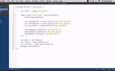 Hello and welcome back to Animating with Snap SVG. Now that we've pulled in our clock SVG file, I want to start talking about how we can pull in the current time using JavaScript and different ways we can display the current time. So before we get started, let's go ahead and make another copy of the site15 folder, and let's rename that to site16, and then will drag site16 down to brackets and open that up. And then in our site16 folder we can take a look at index.html, where we've already loaded in the clock. And we're gonna start writing a lot of JavaScript so I actually wanna pull all of this out and put it in a separate file. So I'm gonna create a new file here, and I'm gonna call it main.js and then in our index.html file up in the head, we're gonna create another script reference. And we're gonna set the source of it equal to main.js. Then I'm gonna grab Grab all of our JavaScript here, and I'm gonna cut it. Get rid of this closing script tag here so that all we have in our body is that div with an id of clock. And then we'll jump into main J.S., let's save that first, and then jump into main J.S. and paste what we have. Now, if we were to test this now, let's go ahead and look at what that's gonna look like. So I'm gonna save that. We'll jump back into index.html. So if everything saved. I want to jump over to our browser and navigate to site 16/index.html. And you'll see that everything goes away. So what we need to do in our JavaScript, let's jump back into main.js, is we need to put all of this inside a window onLoad function. Because we want to wait until the window or the document has finished loading before we start running all of this code. So I'm just going to say window that on load set that equal to a function inside that function. We're going to run all of this code so I can highlight all of that code. Tab it over. And then close off that function at the So let's see if that works. Let's save our file. Jump back into our browser and refresh. And now we can see our clock. So the bulk of the work that we're gonna be doing in this lesson is gonna be in this main.js file, because I really just want to experiment with some ways that we can display the current time. So still inside this onload function here. But after we've loaded our clock. I'm just gonna skip a couple of lines make sure you're inside this closing curly bracket the bottom. And let's create a new variable to store our time in. And the way we get the current time is by creating a new date object, so we can create a variable here, let's call it date. And we're gonna set this equal to a new Date. So here we're creating a new instance of this date object and storing it in a variable called Date. Let's see what that looks like. Let's do a console log, actually let's do a window alert, that'll be easier. We'll do a window.alert, and we're going to display the current date. And again this date here is just this variable we created that's storing this new date in it. I just wanna see what this variable looks like. So let's save our file. Jump back into Chrome and refresh the page, and we get an alert. And this is that date object. So Saturday, September 26 at 22:53. So we're using military time here, it's 10 PM, almost 11 PM. And that's how the new date object works it gives you the current date as well as the current time. And then we can break that up even further. There's a few ways that we can pull in the specific time without having to have that whole string in there. So for example, if we wanted to view hours, minutes, and seconds. Let's create a variable for our hours here, and the way we're going to pull in the current hours is we're gonna point to the date variable that we created. And we're gonna call on getHours, not house, getHours. Open and close parentheses, semi-colon to end our statement. Then we're gonna create a variable for minutes. And will say date.get Minutes. Same thing, open and close parentheses at the end. And we can make this a little bit bigger to make it a little easier to read. And then we'll do the same thing for seconds. So var seconds. And we're obviously going to need all three of these values later on. So we'll do date.get. Seconds, open and close parenthesis, semi-colon to end our statement. Then for window alert, let's just string these three together. So we're gonna take our hours and we're gonna put colons in between these. So we'll say hours plus and then colons inside quotation marks plus minutes, plus a colon inside quotation marks, plus seconds. So we're basically just stringing these three numbers together that we stored in these three variables, and we're putting colons in between them. So let's see how that looks. We'll save our JavaScript file, jump back into our browser and refresh And there we go. So now we have 22.55.38. Well if we don't want military time here we're gonna have to change some things. So instead of 22 we want it to say ten. How can we do that? Well we're gonna need a little bit of math to make this work. So let's jump back into brackets, or whatever text editor you're using and we're gonna talk about the use of the modulus operator. Now if you're a programmer you probably know what this is, but if you're a designer and you've never used the modulus operator, it might be a little confusing. But if you think back to your elementary and junior high days when you were doing simple division. There were times when one number didn't divide evenly into another number. So let's say, for example, 10 divided by 3. 10 divided by 3 gives you 3 with a remainder of one. While using the modulus operator is a good way to get that remainder. So for example, if we were to do 10 modulus 3 here, again that would give you 3 with a remainder of 1, so this operation here would return that remainder, so it would just return 1. Well we're going to use this modulus operator to give us the current time on a 12 hour clock instead of a 24 hour clock. So we're going to go back over h