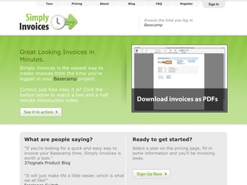 Simply Invoices is an app for creating invoices from time you've logged in a Basecamp project. You can download invoices as PDFs, keep track of your invoices, and create templates for quicker invoice creation.