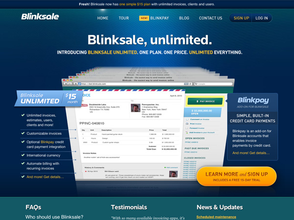 Blinksale lets you create unlimited invoices and estimates for an unlimited number of users and clients. It supports international currencies, automated billing with recurring invoices, and an optional Blinkpay add-on for built-in credit card payments.