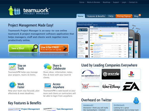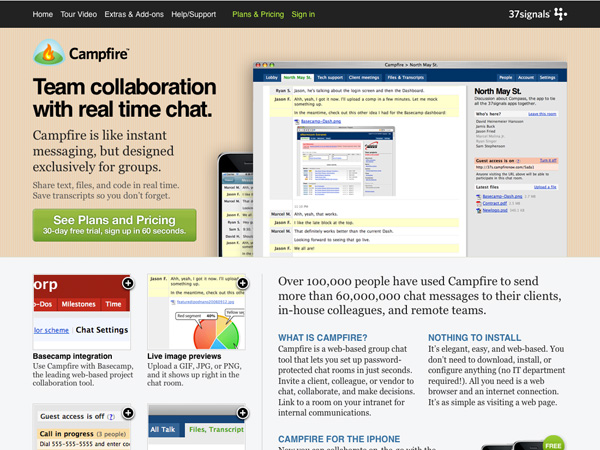 Basecamp, from 37Signals, is a project management and collaboration tool. It includes communication tools, file sharing, the ability to share milestones and to-dos, set deadlines, and much more. There are even project templates to make creating new projects much faster.