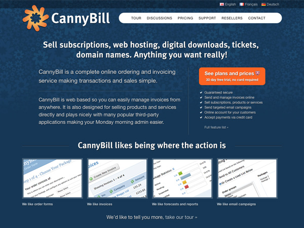 CannyBill is an online ordering and invoicing service that's great for selling things like digital downloads or web hosting. It even includes tools for sending targeted email campaigns. There's a free plan that allows up to three active clients and ten invoices per month, and paid plans start at $7/month.