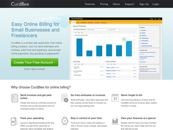 CurdBee offers easy online billing that includes invoice and estimates, as well as time and expense tracking. It even lets you accept online payments. There are both free and paid plans, starting at $5/month