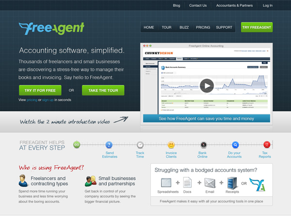 FreeAgent is a bookkeeping and invoicing application specifically designed for small businesses and freelancers. It includes expense tracking, time tracking, account reports, data back-ups, and more.