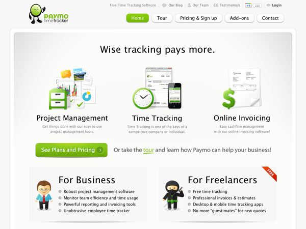 Paymo is a time tracking app that includes online invoicing and project management tools. It's free for freelancers (plans with up to 2 users and 3 invoices per month), and paid plans for businesses with more employees and who need to send more invoices.