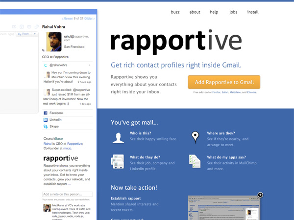 Rapportive gives you rich contact profiles right inside Gmail. You can see profile images, job, company, and LinkedIn information, activity in certain apps, and more. It's a free add-on for Firefox, Safari, Mailplane, and Chrome.