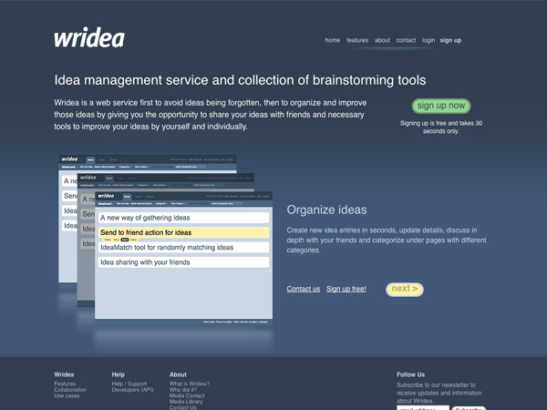 Wridea is a free "idea management" service and brainstorming tool. It helps you keep track of all your ideas for you, and makes it easy to have discussions around them with friends or colleagues.