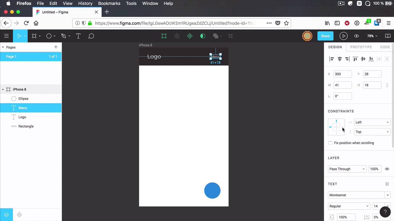 Linear constraints is a feature that allows you to define the elements of behavior on resize. And it's very useful when creating responsive elements and pages. Because you can basically anchor elements to various portions of your frame or you can make them stretch. So let's have a quick look at how this works. I'm gonna create a simple frame, let's say I wanna design an app for a smartphone. And let's create a frame for, let's say, an iPhone 8, okay? And I'm gonna have certain elements in here. Let's add a header. And let's add some text. Let's say logo. Let's reduce the font size of that a little bit. And let's also duplicate this. And let's say Menu. Let's make that smaller as well, okay. And let's also add like a button here, like a call to action. Now, I'm gonna keep this very, very simple so you can understand. What is it that I'm doing. So right off the bat, this looks just fine, right? But what if, at some point, you decide this is actually not the right size that I wanna design for. Maybe I want this to be on iPhone 8 Plus, okay. So you go in and you change this to an iPhone 8 Plus and the size of the frame changes. But then you also have to manually re-size this bit, move this element, move this element. And when you're designing something that's very complex and you have a lot of elements then suddenly this becomes pretty time consuming. Hopefully, or thankfully, you can use layer constraints to automate this process. So basically Figma will do this for you. So here's how you do it. Let's go back to our original size here. And we'll start with the background. So the background, I wanted to stretch so if I resize my frame, I want this header background to stretch along side with it. To do that, we go to the constraints section. And we click this little button right here where it says left and we choose scale, okay? So now if we are gonna resize. This frame, that particular element will scale alongside with it on, of course, just make sure you have the horizontal axis selected, because you can also do it on the vertical axis. But in terms of vertical, I wanted to anchor, anchor it to the very top. So when I resize my frame, this element will always be anchored to the top. Now, what about the logo, right? The logo is actually okay. We don't have to change that but what we do have to change is the main behavior because I want this menu and I want it to be anchored to the right side. So I'm gonna select anchored to the right and anchored to the top. So now, when I resize my frame, the menu stays right there. Same goes for this called action. But I don't want it to be anchored to the top. Instead, I want it to be anchored to the bottom and to the right, okay. So now, when I change my canvas size from an iPhone 8 to an iPhone 8 Plus, my elements will be automatically repositioned and resized in the case of this background, to match my new frame dimensions. And that is super, super cool. Now, when I was tampering with these, you might have seen this check box, fixed position when scrolling this is actually a feature for prototyping. So let's go ahead and group this up. And I'm going to set fixed position when scrolling. Now, when I prototype, I have the option to choose a device size. So let's say, for example, that I choose an iPhone 8. And when I go ahead and preview this. I have the option to scroll my page. Notice that when I scroll this element scrolls alongside with it because it's not fixed, but this header is fixed. So one of those things that's just a prototype thing, it doesn't actually do anything in your design portion here in sigma. Well, it does make a change. It adds a subsection here on the layers panel where it says fixed and scrolls. Basically to differentiate the layers or the groups that are fixed and the ones that scroll alongside with your page. But this doesn't actually stay fixed. If you scroll inside your canvas like this. It's just for prototyping. Now, what other options are there for the constraints? Well, you saw how to anchor elements to the size but it can also anchor them to the center. Notice that we have a center value here. And what that does is basically if you have another item in here. Let's duplicate this. And we'll call it, I don't know, Nav2. Well, let's also. Make this smaller, you can anchor it in the middle, so with this selector I can say that when I resize this horizontally I want to keep it in the center. So i'm going to select center from here, and now upon resize you'll notice that the element always stays in the center of my element, which is fantastic. And that's a quick look at layer constraints in Figma. Now, coming up is version history. This is a feature that allows you to browse the entire history of your document, and if you want, assign names to each individual version. More about that in the next lesson