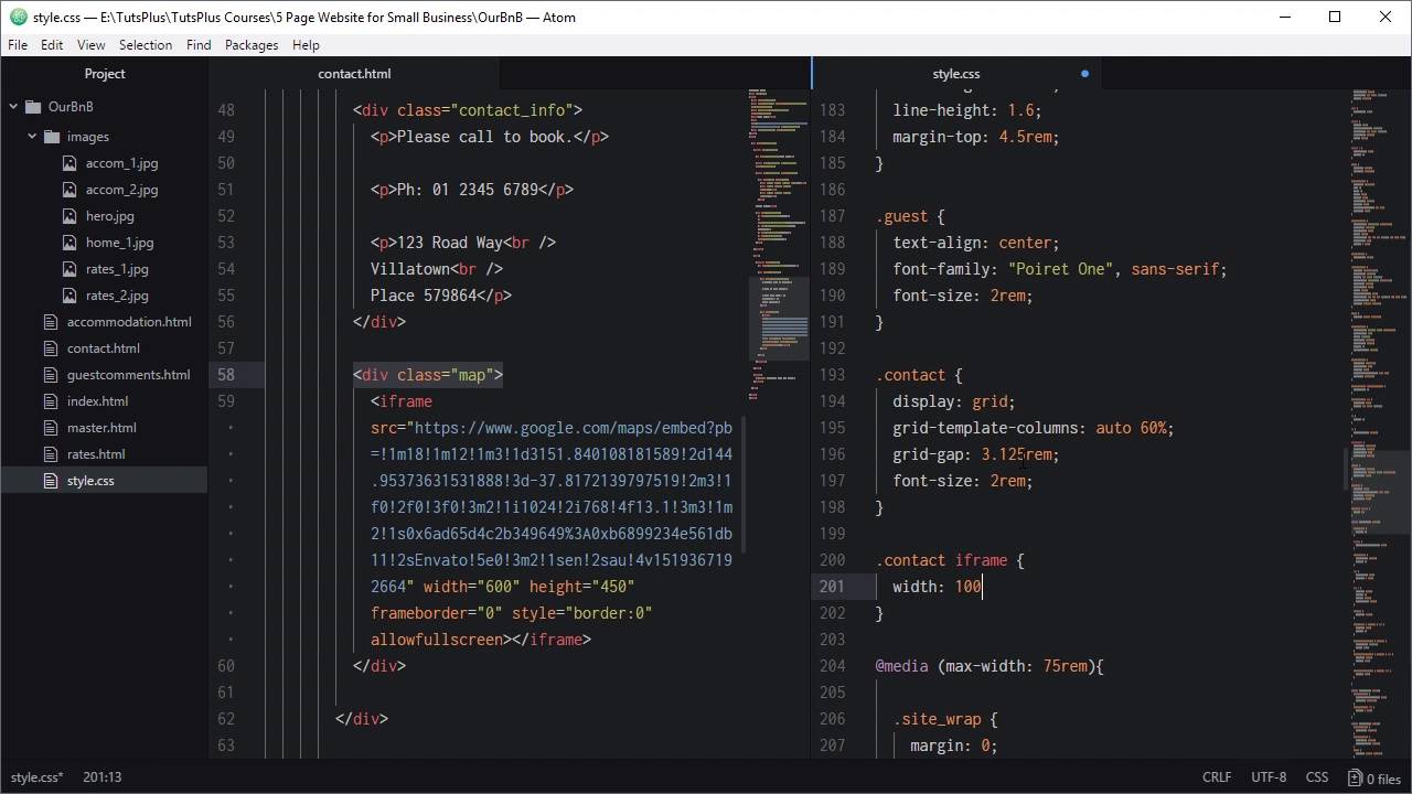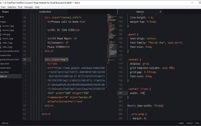 Hi, welcome back to build a classic five page website. We're now on to coding out the last page of our five page website, and that is the contact page. What we're gonna do with this one, is just add some contact details on the left, and an embedded Google map on the right. So we're gonna make this in the same way that we made our last page, by duplicating the master page. Gonna name that contact. So we want to set the correct link as the active link, change that onto contact down here. Now, we need to add in our page section wrapper. We'll add in our heading H2, plus page_heading, and we'll set the heading to read contact. And we're gonna be using our ever-helpful CSS grid to handle the layout of this again. So we're gonna add a dev with the class contact, this is gonna be a grid wrapper. Every time you use CSS grids you need to have a container element for it. Inside we'll add the children that are gonna be turned into grid cells. So the first one is gonna be a dev with the class contact info, it'll be contact_info. And then we'll have another one with the class map. And in here we're just gonna add in a few paragraphs. Each one of these paragraphs is gonna have each of three blocks of text. And we're just gonna use breaks to put each of these lines of the actual address onto a new line. We'll do that with this code. You just go to paragraphs and our breaks here. And then for the map what we're gonna do is just drop in an IFrame. And this IFrame code just came from going to Google Maps hitting the share button, and then grabbing the embed map code here, so that's all we needed for that. Because we're just doing a static website, something that can be just embedded in a IFrame like this is perfect for what we need. So now we'll add in our code that's gonna turn our contact element into a grid. Above our media queries gonna target our contact class, so to be display grid, like we did for our other classes. Set up our columns for our grid with grid-template-columns. Now we want our map to take up 60% of the width and our address details to take up the rest of the amount. So we're going to say order, so orde width on the first column, and 60% width on the second column. But we want some space in between that text and the map, so we're gonna say grid gap is 3.125 rem. And we want to have our font size be a little bit larger than default, so it's nice and easy to read. So we're gonna change the font size up to 2rem. And we also wanna make sure that this IFrame is always filling out this grid cell here. So, we're gonna do that by targeting our contact class and any iframe that's a child of that contact class, and setting it to width to 100%. All right, let's see what we've got. We'll hit our contact menu item. There we go. So now we've got our text on the left, that's all good, and we've got our map on the right. So that is excellent. Now, we need to check how it looks when we shrink down the layout. As we shrink this down the text starts to get a bit crowded, and then there's definitely not enough room for two columns as we go down, so we'll five that up. So in our 55 room media query, target our content class. And we're gonna drop the font size down to 1.5 rem. We're gonna do the same thing, for our 45 rem media query, and this time, we're going to drop that font size down to 1.25. Let's see what we've got. All right, so let's trunk there, that's still looking good. And so now we also need to add in a collapse point where this goes down to a single column. The next media query that we have in is 22 rem. So it's probably gonna happen a little bit too late. We have a media query there at 45 rem, that's a little bit too early to stack these elements on top of each other, but 22 rem Is a little bit too late. So what we are gonna do instead is we are gonna add another media query at 40 rem. And here's where we're going to collapse that grid down so that both becomes 100% which forces them to sit on top of each other. And now, because that text is gonna be on top of the map, we're gonna center align and so that the look could be later. So we shrink it down, and there we go so now that's collapsed down. We've got our center text, and that's gonna be fine as you continue to shrink that down. All right, so that is all done, we've got our contact page. And that is the fifth page of our hand coded static website. We've got our homepage all looking good, we got our accommodation page, Our guest comments page, Our rates page. And our contact page. So these are a type of site that I actually still see around a lot. Especially in smaller towns where you have businesses that don't have a $20,000 budget to put in to a website, but they do want to have a web presence online. So these types of static sites they might not be the most prevalent website that you find out there like they used to be some years ago. But they are still there, they are still needed by a lot of people, and they're definitely something that you should feel confident that you can do yourself as a web designer. Sometimes it's a good idea to just boil everything back down to basics and to see what you can produce, with just those fundamental tools of HTML, CSS, and a couple of photographs. Now we've got just one more video in the course. What we're gonna do is extract the key points that we've covered here, put them into a bullet list, so that you have everything down in a nutshell. You can come back and refer to this video any time you need a refresher, on what we covered with this topic. So we'll see you in the final video