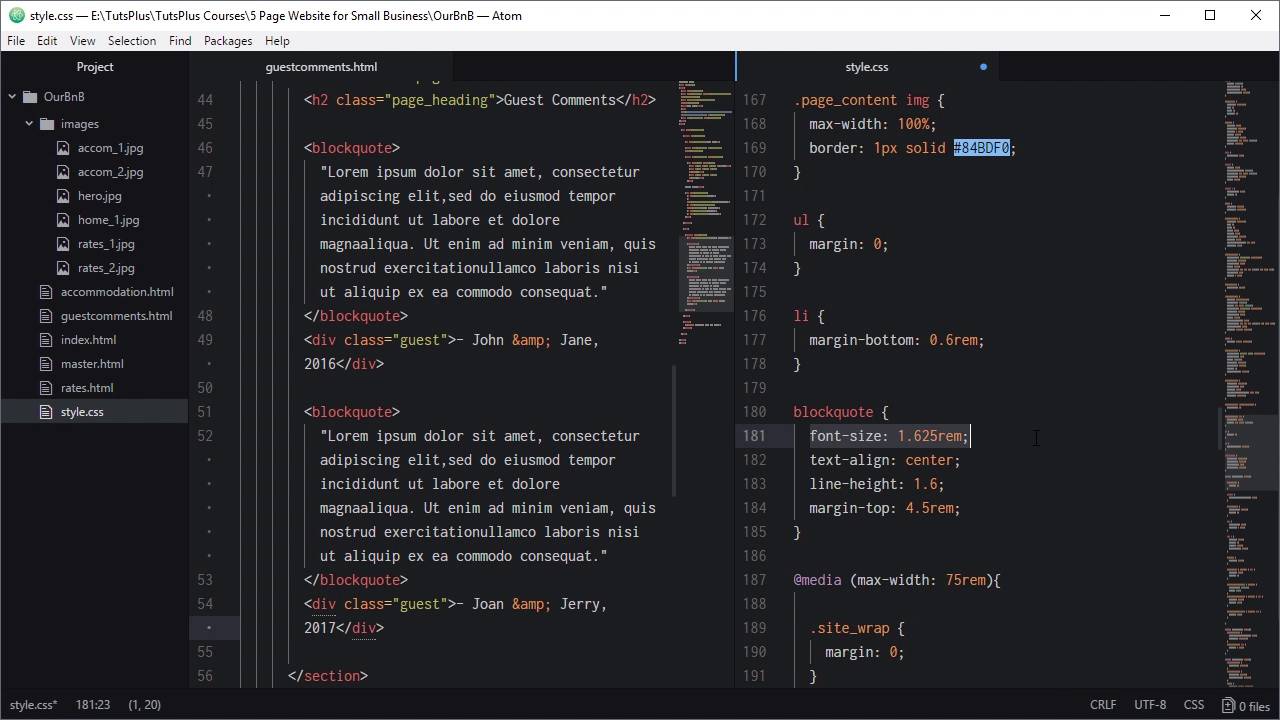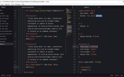 Hello, and welcome back to Build a Classic 5 Page Website. We're about to make the fourth of our five pages, and that is gonna be our guest comments page. For this one, we're gonna be using the black white element to display this text here. So it's just gonna be a matter of styling up that text and styling up our attributions. This time, we're gonna work off the master html page that we created before. So we'll duplicate that and name it guestcomments. The first thing we need do, like we did with the last couple of pages, is change which of these items has class active applied to it that are in guestcomments. And now, we can start adding in our wrapper elements that we need for all our pages. So the first one is section, the class page. We need our h2 heading with the class page_heading. And I'm gonna add in the heading Guest Comments. Now in here, we can start adding in the comments, and then we'll start on the map. So a blockquote element, need a citation link there so we'll just delete that. And in here, we can grab this text and paste it in. Then we need to give credit to the guest who made the comment. So we're just gonna use a div here with the class guest. And I'm just gonna put- John and Jane, 2016. And we want the same thing again. We're gonna have two comments in here, so we're just gonna copy and paste all that html. And we're just gonna change that to Joan and Jerry 2017. So now we'll go ahead and add some styling to control our blockquote. Back up above, our media queries, too high [INAUDIBLE]. I'm just gonna add in this styling for our blockquote. We don't need to specify a font family here because this is gonna be using the default font family that we applied to the body element. But here, we're just setting in the correct font sizing, aligning it to the center. Controlling our line height for our blockquote, and then just adding some spacing above each of the blockquotes so it doesn't get crowded against the one above it. Now to style our guest attribution, we need to add styling for the class guest. Once again, we're center aligning that text. This time we're gonna change the font. We'll set it to Poiret One and we'll increase its font-size up to 2rem. So, that's our essential styling incurred or put in place. So, let's have a look. Click our Guest Comments page. All right, so there we go. That's all looking really nice, our heading coming up just as we needed. We've got our blockquotes in there. We've got our attribution, a good amount of space in there. Everything is centered, and the line height makes everything nice and readable. What we still need to do though is a little bit of adjustment for responsiveness. When we shrink this down, that text is a little bit on the large side. So we're gonna go down to our 45rem media query. We're gonna add in these adjustments. So we're decreasing the font size that's used in the blockquote and the font size that's used in the guest attribution. And we're also decreasing the amount of space between the blockquote and the heading above it. So we're doing there the same thing that we did here with the page heading just reducing that space. Then we're gonna need to do the same thing for our 22rem media query. So we're shrinking down that spacing again, and we're reducing the font size and moving over to using a VW-based font size instead of a rem-based font size. So now let's see how that looks. Now that's much better. Everything fits in here a lot more comfortably, and everything is still staying readable. You can see that as we shrink it down, Everything adjusts and stays looking good. All right, so now we're almost there, we've just got one more page to code up, and that is our contact page. So that one, this is another one that we've kept pretty straightforward as well. So, we're just gonna be adding in contact text on the left side and an embedded Google Map on the right side. And we're gonna do that in the next lesson. I'll see you there.
