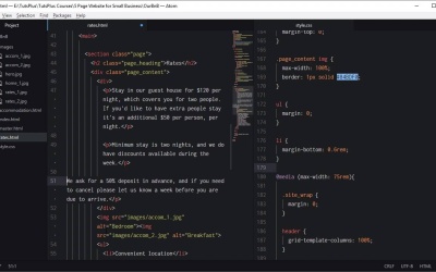 Hello, and welcome back to Build a Classic Five Page Website. In the last lesson, we coded up the accomodation page, which we have on screen here. And in this lesson, we're going to take this page, duplicate it, make a couple of edits, and hey presto, it's gonna turn into the right page. All right, let's go ahead and do that. So we will right-click on the combination page, duplicate it and then you file rate.html. Now this is probably gonna be the quickest of all the pages that we create, cuz there's only a couple of things we have to do. First up we'll take the active class of the combination link and put it onto the rates link. Then change the heading so that it reads rates. Now, we just need to carry over the content from our rates page mock up. So we've got a few paragraphs here. Copy all of that text, gonna add it in here. And we're just gonna need to add an extra couple of paragraph tags. So that each one of these paragraphs is individually wrapped. And you see how we've got these individual paragraph tags here. That's why we added this empty div in here before. If we didn't, then each one of these paragraphs would be turned into a grid cell and we don't want that. We want this to be treated as the grid cell, so that was the reason for that. Now we'll add in our different images. We've got rates_1 and rates_2. And then we've got a different set of list items. So you'll just do the same thing as you did before, add in the list items. I'll just copy and paste those in. And that's it. Just like that. And we're gonna hit the rates link. And there we go. Super straight forward and super quick. So if you get the chance with a site like this, that is static, try to make it as easy on yourself as possible and reuse elements wherever you can. That can also help with the process of coming back and doing any manual updates later if you need to. And again, of course, because we're using the exact same code as on our other pages, the responsiveness is already completely taken care of. Now we've only got two more pages to code up. And the next one that we're gonna tackle out of those is the Guest Comments page. So we're gonna to that in the next lesson. I"ll see you there.