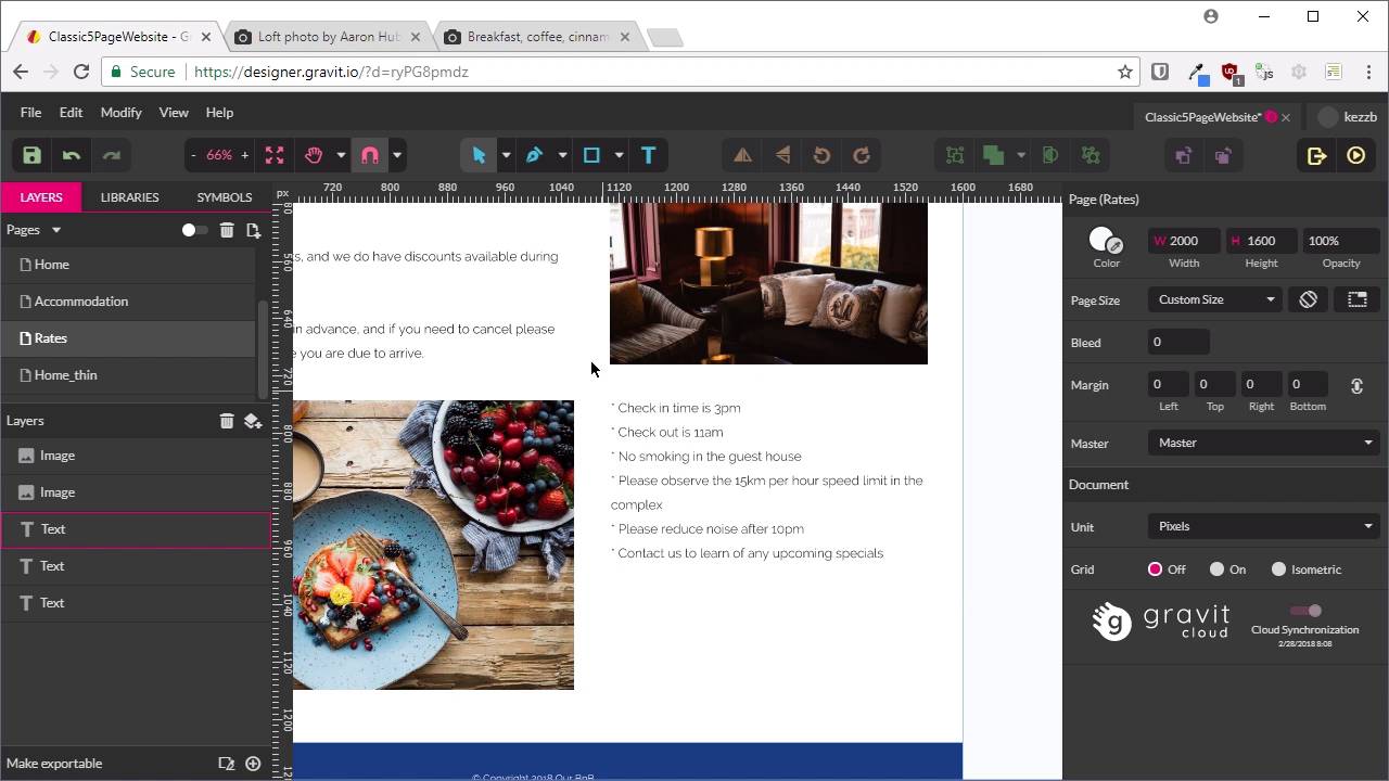 Hey, welcome back to your build the classic five page website. In the last season, we created the Accommodation page, which is going really straight forward with this design, just the heading, some text and a couple of images. And this is sheets that in the case of doing a site like this for real client, that will provide you with photographs of the business. And some text on the business as well that you would then assemble in the way that you're doing this. And so now we're going to skip over to the Rights page. Even though it's not next in the menu, we're gonna do a design for the Right page it's going to be basically identical to the Accommodation page. Really doesn't hurt to try to replicate things that you've done, use them more than once to make things more efficient. So it's gonna be the same process again to duplicate this page. Switch to Multi-Page mode, select the Accommodation page. Hit Ctrl+D. Give it a second, then Rename this page to rates. Then will go back to single page mode. And we're gonna select our Master page, again here. And now all we need to do is just replace this content with content for the Rates page, gonna change accommodation to read rates. And now, we're gonna replace this content with some placeholder text on the right for our imaginary bed and breakfast. So, $120 a night, blah, blah, blah. We're gonna replace this bullet list here, with a different set of information to do with the business. They can even just fill this in with your origin place all the bullet here. Or if you want your font this design font is available in the source file for this course. So you can just copy and paste in if you prefer. So now we've got all of our text is updated for this Rates page, now we need to do is replace this image, so back to unsplash. Again, links are in the notes below this video. We'll copy this image in, we're gonna replace this one with it. So we need to be 445 pixels wide, go ahead and do that, 445. Just get it lined up in the same spot and now we can go ahead and delete the other image. And here's another breakfast image for our bed and breakfast. We're gonna copy that one in as well and replace this 606 wide image with it, that'll be 606. And this one's actually a little too high for this area, so what we're gonna do is a bit of a trick. We've got our underlying image here, just this one, I've got it selected. We can see the pinky purple outline there, I'm gonna use this as a clipping box. So I'm gonna take the image that we just bought in, drag and drop it onto the other image, and you can see there that it just clipped the bottom off. So that image is now controlling the size of the image that you have here, so that makes the layout correct. And that is all that we need to do for this Rates page. So that's a really straight forward one, nice and quick. And now we can move on to our fourth page which is the guest Comments page. So we're gonna go through setting up that page design in the next lesson, I'll see you there.