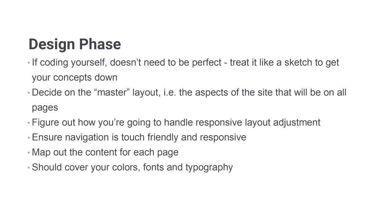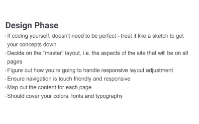 Welcome to the final video in Build a Classic 5 Page Website. So we're just gonna quickly go through and summarize everything that we've covered. This will give you a bit of a list that you can return back to in the future when you just want an overview of how to create this type of a static website. First up we've got the design phase. As I said a couple of times, you really don’t need to worry about being too absolutely perfect with the design phase, if you’re gonna be coding things yourself. If you’re creating a design for another person to code up, then you need to be absolutely precise so that that person knows exactly what you're trying to get onto the screen. But when you're gonna be coding up something yourself, really, what you're doing is more like a concept document. It's pretty much the same as just getting a sketch on a piece of paper, but it enables you to get a little bit more detail than that down. So don't worry too much about things being perfect, just get all your ideas onto the screen. The first thing that you wanna do is create a master layout, so that you use all of the aspects of the site that are gonna be on every page, so your header, your footer, your navigation menu, that type of thing. And if you are using Grabit, then it's very handy for this type of functionality because it does give you that option to bring your whole layout in as a background to a page that you subsequently create. As part of this process, you wanna figure out how you're gonna handle responsive layout adjustments. So you wanna figure out where fonts are gonna be too big at the smallest size, where you're gonna need single columns, how those single columns are going to rearrange content. And then on top of that, you need to make sure that your navigation is touch friendly and it's responsive. This is one of the things that's still really quite surprisingly common in websites now, is that they're often not touch friendly. They might depend on things like hover effects to create drop down menus and things like that. So definitely always have a plan for how your navigation is gonna be touch friendly, whether it's at full width or at teeny tiny thin width. And in order to make it comfortable at teeny tiny thin width, you're probably gonna need to have some type of collapsible menu like we created. Once you've got all of these masked elements in place, then you can go in here and map out the content for each page. You're also gonna need to have some plan in mind for how to collapse that content, as well. And in the process of doing all of the above, you should also make sure that you've covered your selection of colors, your selection of fonts and all of your typography, so the sizes, the weights, the line heights, everything to do with your type. When you've done all of that, you're ready to move on to coding. So just like you did with your design phase, first code up your master layers. So you can just do that in a single file called master, and you can get all of these common aspects into this one file. Then you've got something that you can duplicate every time you need to create a new page. Even though you have that, sometimes you're not gonna wanna duplicate the master page, because you might have two pages that are very similar. So that means it can be faster to just duplicate that completed page, the first of the similar ones that you do. And then just make edits to that duplicated page in order to create the second page. And we did that with the accommodation and the rates page. And as you go through and you create each one of these HTML pages, it's really important that you bring up those responsive tools in Chrome or whichever browser you're using. And you're constantly adjusting the width of the viewpoint, so that you can simulate all different types of devices. And you can make sure that your site looks good at every possible width. So you're not just saying all right, it's good at 1,200 pixels, and 1,024 pixels, and 320 pixels. Now you know that it's good at any width because you've checked it out at its maximum possible width and everything below that. And to help you with easy adjustment of your layouts for responsiveness, CSS Grid can be incredibly handy. It still doesn't support some old browsers. So if you are doing a project where you really do need support, outdated and obsolete browsers, sometimes you have to do it. You might not be able to use CSS Grid. But otherwise, then you can use CSS Grid. And it's gonna allow you to control your layout with minimal code, far less code than you need with any other type of layout control. And on that point, that wraps up Build a Classic 5 Page Website. Ao I hope you've enjoyed sort of getting back to basics with this course, this reminded you of how much you really can achieve with just HTML and CSS, and that it's helping you sharpen up those fundamentals of web design. So thanks very much for taking this course, and I will see you in the next one.