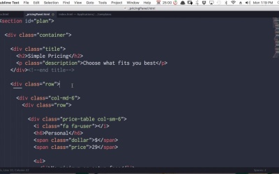 Hey welcome back to Building Landing pages with Craft CMS. In the last lesson, we just finished setting up all the back-end requirements for our pricing panel. In this lesson, we're gonna set up an entry for each one of these pricing packages and then we're gonna create our template for this pricing panel. So, let's jump into our back-end. We'll go into entries, and we're going to create a new home panels entry, From the entry type. We're gonna select pricing. And there's all the fields, that we just set up in the last lesson. Now ,we're ready to start adding in all of the content that we need. So we'll speed things up by doing a little bit of copy paste. So the first plan is the personal plan. Now in order to get the same icon, you can either inspect the code here and look for the name of the icon here. So then, you will be able to copy and paste. Or if you don't wanna do that, you can go through the template in our studyguide.html, look for the section with the ID plan. And then go down here, and you can see the icon that's used for each one of the pricing packages. So then we'll add that in here. For currency, we're just gonna leave that blank, because when we code up the template, I'm gonna show you how to complete a fallback default. The price we need to set to 29. And then the features, we're gonna copy all of these. Paste it into the rich text field. And then just get rid of that space at the beginning. So, that is our first one done. Save that and on to the next one. Choose the pricing type, we need a small team, You gonna inspect that icon and this one is fa-users, plural. The price is $39, And then a copy in now feature list. There we go. We'll save that one too, the third package. Same thing again. Let's get this out of the way. Copy everything over. See what the icon is. If a bank, Price is 49. Copy the feature list. And save, and then the last one. Corporate. The icon is fa-briefcase. The price is 59. And then we'll get our feature list in. And let's save. So now we've got all four of our entries there, and we're ready to move on to coding up our template. So we'll head into our templates folder, and create another new template. We'll call this one _pricingPanel. And open that up for editing. And to start with, we're gonna go into a static HTML template. And we're gonna copy all the HTML for the entire panel. So that's the section with the ID plan, which grabs the whole lot. Right down to where it says end plan, then we drop then we'll drop that into our new template. Now we need to figure out which elements of this code we need to repeat for every entry, which elements we need to repeat maybe every second time, and which elements don't need to repeat at all. So we'll do that by inspecting the code on the static version of what we're working with. So if we look here, we can see that there are a couple of things that only need to be in there once. So the section with the ID plan, only need that once. This div container, we only need that once. This title section, With this text here, is also only needed once. And if we keep working through these elements, there's another div in the class that's also, you can see, is only needed once. Here though, we start to get into another section of code that is repeated. So if you have a look at this div here with the class col-md-6, this is used twice in this panel. And that's so that as you shrink down the window, the panel can collapse itself into two rows of two columns. So we're gonna need to make sure that we have this repeating itself twice. We're gonna do that by using that divisible by function that we used in the last lesson. For the first entry, we're gonna have these opening divs col-md-6 and row. And then every second entry, we're gonna close those two divs. Then inside that, this is the code that's gonna need to be repeated for every single entry. And you can identify it by looking for the class price table. So we're gonna make sure that this HTML repeats for every single entry. If that doesn't make complete sense yet, don't worry, because we're gonna be stepping through all of that coding and that's all gonna make sense as you're putting the code together. All right, so back into our HTML, and we know from what we just looked at, that this HTML here only needs to be in once. So our for loop that we used to start outputting our entries, needs to be inserted here after the first div that has the class row. So just like before, we're gonna say for entry in, and then we'll dig into craft.entries.section. We want something from our home panel section. And what we want is an entry type, And we want the entry type pricing. Let me just set up our syntax highlighting again or I said that is the for loop that we want. Now we just need to go down, all the way down here and finish a for loop. Right at the bottom here, before these last two closing divs, and this closing section tag. Now, let's organize the code that we need to have be output for every single entry. And as we learnt when we went through and inspected the code in a static version of this, what we need is this HTML here that starts with a div that has the class price table and it ends with this comment here, price table. So let's just copy that, we're gonna scroll all the way back up. And we're gonna add this code again, just inside the for loop we just created. Now, we're gonna replace this static content with dynamic content that we're pulling in from our craft site. So first up, this is the class that determines what icon is displayed at the top of each entry. So we're gonna replace that with entry.fontAwesomeIcon. This is where our entry.title goes. We're just gonna skip the currency symbol for a second, we'll come back to that shortly. The price we replace with entry.price. And then this entire unordered list can be deleted and replaced with entry.featureList. Now up here, with our dollar sign here, we're gonna do something a little different. We're gonna include a d