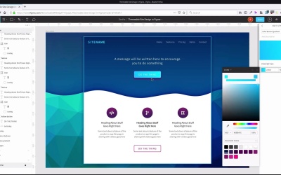 Hey, welcome back to Create a Themable Site Design in Figma. In the last lesson, we started working with the document styles that we've created to modify the color scheme into a blue themed version of our design. In this lesson, we're gonna go through and do recoloring on the site name, and on the solid button. So click outside of the frame to make sure we have nothing selected which gives us access to our local styles. And here is the gradient that we have applied to our title. So we're gonna go into that, open up the color picker, and we're gonna start modifying those colors. And just like we did with the purple color scheme, with the background, we sampled from this sort of area in the background color. We want the foreground to be bright and more luminous, so we're gonna sample for those colors up around here. So for the dark color, we'd probably go with something around about like this. And then the lighter color, would be somewhere probably around like this. You can see that right away we've got a nice luminous look on the site name, and a good contrast with the background. But if you would like to use the exact same color codes that I'm using, then for the dark color, I'm using 0DB4FC, and for the light color, I'm using 01F0FF. So that is the title, all taken care of. Now we need to modify the colors that we're applying to our solid button, here. So first up, we're gonna change the gradient. So we have solid button, gradient, jump in here and we would probably use pretty much the same colors that we're using in our site name. In a lot of cases, it's gonna be fine to just sample directly from the site name to get both of the colors. In this case it is a little bit too light. Sometimes you might wanna sample a color and then, perhaps drag down into a different part of the picker until you get to a good color. For me, after messing around with the colors for a little bit, I ended up with 12B7CD on the light color. And on the dark color, 0981B4. So that gives us a decent level of contrast between the light text and the darker-colored background, while still giving us a luminosity to also contrast with the darker blue background that surrounds the button. So, our next solid button style that we need to change up, is the color of the stroke. With this one, again, you could just sample directly from the top corner of the button, and that is gonna give you a pretty nice color. In my case, I ended up with the stroke color 12B7CD. And then we have just one more solid button style to modify and that is our shadow which is down here. So we're gonna open up the properties and this is where you could do something like sampling the shadow color that we already have down here. And then adjusting that until you get it just perfect, the shadow color. So that's already pretty good. The code that I ended up with was 013386 And now we have the whole top section of the site completely re-themed into a blue color scheme. Now all we have to change up for the rest of this blue theme is the color of our icons and the color of this button down on the bottom here, and we're gonna do that in the next video. I'll see you there.