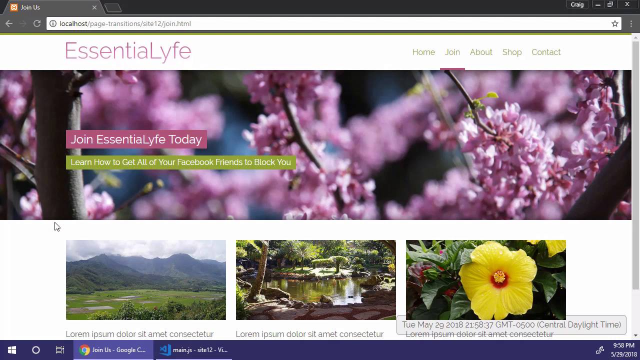 Hello, and welcome back. In this lesson, I wanna just put a couple of finishing touches on our site. The first thing I want to do, very quickly, is I want to update the title when we go to a new page. So if I go to index.html here, and then click on Join, everything changes, even our URL changes, everything looks great. But our page title has not changed. Our page title still says Page Transitions. Whereas if we navigate to join that HTML inner browser bar, you'll see that the title says Join us. So I wanna make sure that that title actually changes whenever we click on the Join button or when we click back on the home button. So let's jump into our code. And we're now in the SITE12 folder. So all the changes we make in this lesson will be saved there. And this is a pretty simple process here. We're gonna go down to our loadNewPage method. And the first thing I wanna do is I wanna grab the new title from the HTML that's been loaded into our loading container here. And we've done something similar with our HTML. We've done a container.find, and we've found our main content inside that HTML that's been loaded. And we've done something similar with the page ID. Now I wanna do it with the title. So after everything for our page ID, I'm gonna create a variable here called newTitle. And we're gonna do something similar to what we've done before, we're gonna do container.find and what we're looking for is the title, so we're looking for an element called title. And even though that element is in the head of the HTML document, we can still find it this way. The only thing we need to add to this is inside square brackets, we need to put the number 0 to indicate that we're only gonna grab the first title that we find. Now, you're not gonna find more than one title in an HTML file, but it's not gonna work if you don't do it this way. So we're gonna put our square brackets immediately after title. There's no spaces there. To indicate that we're going to grab the first title that we find. And then we're gonna grab the text from that title element. And we can do that by typing .text. So the title for our Join page, once we click on the Join button should now be stored in this newTitle variable. Now someday, we're gonna be able to put that new title into this pushState method for our second argument here. So for our second argument, we can just change that to newTitle, but that's not gonna work for very many browsers at the time of this recording. So if I were to save that, jump over to our site and refresh it, and then click on Join, You'll see that that doesn't actually work. I'm in Chrome right now. And this is the latest version of Chrome at the time of this recording. And that doesn't work just yet. However, that method does accept that value there. Just at this point, not a lot of browsers do anything with it. So we need to actually do that manually. So the way we're gonna do that is immediately after we create that newTitle variable, we're gonna find the title on our current page. Not within our container any more, but we're gonna find the title on our current page, and we'll do that with a jQuery selector here. And we're simply gonna say .html, and then inside parentheses for the html method we're gonna pass in our newTitle. That we just calculated up here, and that should do the trick for us. So we're gonna save that again, go back to our browser and refresh the page, and now when we click on Join, once our new page loads, you'll see that the title changes as well up here at the top. So we've now changed our title and then the last finishing touch I wanna put on the site, well, actually, there's two more things. One thing I wanna do is I wanna get rid of this timestamp down here now, because we don't need that anymore. So I'm just gonna go to our index.html and I'll leave that there for you. But I am just gonna comment it out, and I believe it's down here. I can't remember where I put it. It's right here at the very top, timeofday. So I'm just gonna grab that and comment that out, and then in our JavaScript, I'm gonna get rid of this line of code here by commenting it out as well, where it's setting the timeofday there. That way it'll just clean up our page a little bit, but then the last thing that I do wanna do here is I wanna make this compatible with all browsers. So even if you're using a browser that doesn't support the history API, I want this to continue to work. And so the way I'm gonna do that is I want to detect whether your browser supports or recognizes the history API. And if it does, then we'll go ahead and do everything we've already done. If not, then we're just gonna navigate from one page to the next. So, let's see how that works. We're gonna go back into our code. And in our register event listeners, we have our click event, for our transition links. And this is what causes all of these fancy page changes. We're preventing the default behavior of the link and then we're doing our own thing. And then we have the popstate event, which is very specific to the history API. But what I wanna do is I only want to run these two items if the history API exists on the current browser or if it's supported on the current browser. And a very easy way to do that is we can simply say if and then put in the word history here. And what that does is if that history is not recognized by the current browser, or in other words, if that history object doesn't exist for the current browser, then it will simply ignore, it will treat that as a false and ignore all of this code. Otherwise, if the history does exist, then it will just treat it like a true. If you just say, if and then put the name of an object there, then if that object exists, it'll treat it like a true value. It's called a truthy value. So in other words, we're only gonna run all of this code we've been working on if our browser supports the the history API, otherwise it's going to work just like an old school HTML page. And that's