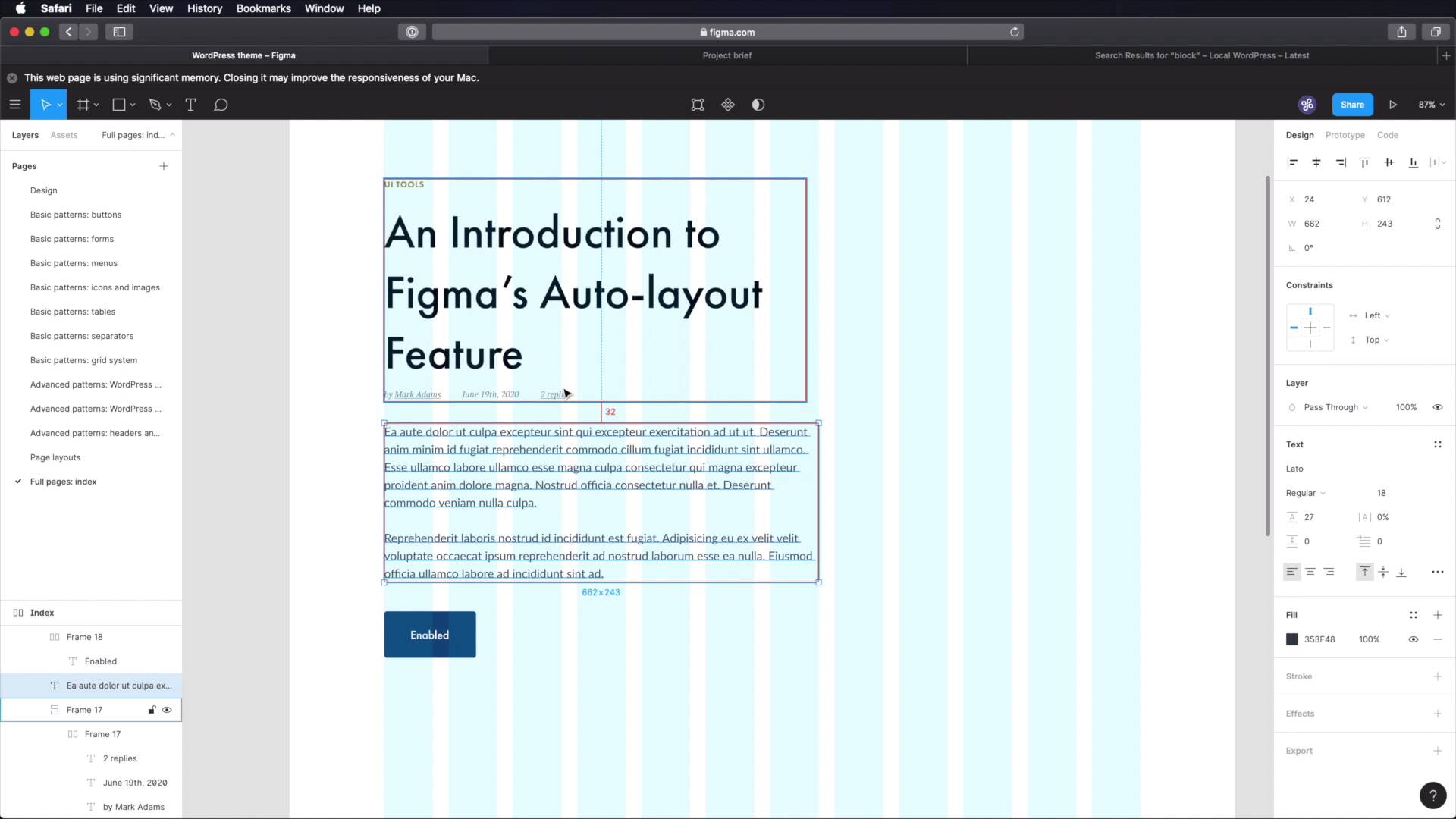 Welcome back to the course. In this final lesson, we're gonna take the design system that we've built and create a full page, the index. And hopefully this process will show you how to create the rest of the pages based on the same design system. So, let's go. I'm gonna start by creating a, New page here in Sigma. I'm gonna call it Full Pages Index. Create a frame, let's call this Index. And inside of it, let's create another frame, 1,200 pixels. Let's do like 2,000, for the height. And let's add a layout of grid, columns 12, Something like that. 24 margin 24 gutter, okay? So with this, let's align it in the middle and at the top, and let's actually add an Auto Layout, to this parent frame so that it resizes automatically with my inner frame. Okay, so where do we start? Well, with our little sketch here, right, the index page. First, we have a header. So let's go ahead and grab that. We'll go to Headers and Footers, we'll grab the one for desktop, copy, paste. Let's align it properly. And let's leave about 64 pixels from the top. We can also use auto layout for this frame, but that takes a little bit longer to set up. So I'm just gonna do it the old fashioned way, just in case you're using some other software that doesn't auto layout. All right, so that's the header, what's next? We have post and sidebar. Okay, let's start with the posts. So we're gonna grab, This post right here, or actually we don't need all of it, we just need the first part. So we're gonna grab this, this and this. Copy, paste, and let's position these at about 128 from the header. Just leave lots of room for for breathing there. Now as a small change, compared to what we did here, we're gonna remove the separator, just to keep things a bit nicer. And we're gonna position the set about 48 pixels from the post intro. And also, we're gonna make this a bit smaller because I want my sidebar to fit in four columns and I also want one column of empty space between the two sides. So, let's change this. All right, let's bring this back up to 48 pixels, like so. And we also need to add a little button here for Read More. So let's go to Buttons, we'll grab one of these medium buttons, paste that in. And, now that I think about it, I think a little bit more or a little bit less space between these two elements is probably a good thing. So let's go 32 pixels here, and also 32 pixels here. All right, let's take a look at it without the grid. That looks pretty good. So now we have this, this and this. We can do an auto layout for them. Also, let's make this a little bit bigger. All right, so now I have this, this and this. Here we can do an auto layout, it's gonna automatically switch to vertical with 32 pixels between items, so that's cool. And now, what we can do is just duplicate this bit, move it down, leave 128 pixels between these two. And now I can also select these and hit shift A to create another frame with auto layout. Notice that it automatically added 128 between items. So now what I can do is just command D, duplicate, a post here and it's automatically gonna be positioned correctly. Now let's move on to the sidebar. For this, we're gonna add two widgets and let's see where those are, right here. We're gonna use the search widget and categories. So, grab the Search, position it right there. Like so. And we gotta do a quick change to the width of this element. Let's change that width, so that it matches our four columns. And we're gonna skip the widget title on this case, but we will use it on the Categories here. So let's grab that copy, paste it in. We're gonna leave 64 pixels between these two. And we can also Shift+A these into a new frame with auto layout. So then when I create another widget, it's automatically gonna be positioned correctly. Okay, so far so good, we have the header we have the content or the posts and we have the sidebar. Finally, we got to add the footer. So let's go grab our desktop footer, copy that, paste it in. Okay, and, Let's make sure we have 64 pixels of space here, let's hide our columns, and here we go. This is our index page, created in a matter of minutes, simply because we used our design system and we had those components already built. Final thing to do here, which I forgot is to change the text on these buttons. They should just say Read more. Like so. All right, and that's how you can use the design system to create a page for our WordPress theme. And you can apply the same process to the rest of the pages and I guarantee you'll get great results. Now please join me in the next lesson for the conclusion of this course. See you there