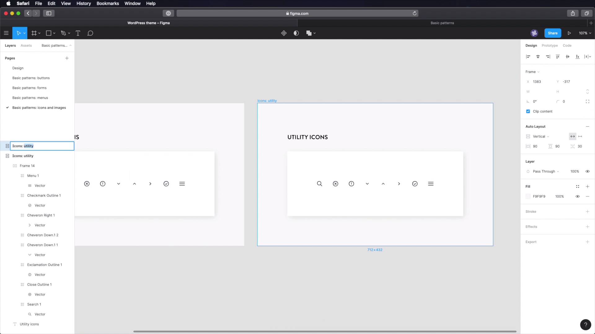 Welcome back to the course. Let's continue building our WordPress theme design system by documenting how we're gonna use icons and images. Let's begin. As per usual, we're gonna start with a new page. We're gonna call it Basic patterns, Icons and images. Let me just copy one of these frames to make things easier for us. And we'll start with Icons utility. So for this theme, I'm breaking down the icons in two types. One is utility and two is decorative. Utility refers to icons that are used in very specific context like a search icon. Or one of those loop icons being used in a search form, or the chevron down icon that you saw me use in the drop down menu, okay? Or the contextual icons that I used in the form design with the x for error, check mark for valid. Or actually, I didn't use the check mark. Or the exclamation mark for warning, right? Those are the types of icons that I consider to be utility icons. Decorative icons on the other hand have, well decorative roll, right? And they're meant to be used alongside text to create a feature or a walk-through, stuff like that. This is a very common practice in web design, right? You have three columns of content, an icon on top, a title and a small description, and possibly a link or a button, right? Those are the types of icons that are consider to be decorative, okay? So we're gonna start here with utility icons. Let's delete that and let's delete that. And let's delete that. And inside, well, we're just gonna put all the icons that we're gonna use or plan on using in this project and of course the list will grow over time. But at the end, you'll have a clear list of, okay, so here are all the icons that I used in this project and I can just export these as SVG. And don't worry about it, I won't have to load an entire icon library just to use these five or ten icons so it's always a good thing to have. So now, we're gonna, [COUGH] excuse me, we're gonna go through the list here. And we're gonna grab the ones that we're using. Paste them in. What else? We have these two. So copy that. Paste it in. Copy that, paste it in. And what else? We have one on menus here. Copy it, paste it. And we'll have some other ones. We're gonna grab the reverse of this, which actually we'll just duplicate and we'll rotate by flipping it. And then we'll grab a new one, we'll paste that in. And what else? I think we got all of them, right? So let's also do a check mark. You never know how you're gonna need that. And let's grab a menu icon. And by the way, these are all from the same set. They're all from here zone icons. And I think we're done with utility icons. As I was saying, if we're gonna have more then we're gonna add more. So just to clear things up a little bit, let's make sure all of these have the same characteristics, which means 16 pixels size. And actually, because I had to make that change it means that on the forms side, I actually didn't size this correctly, did I? No, I forgot. Excuse me. I'm sorry. There you go. There you go, now that's cool. So let's also change the color of these, and let's change the color, Of this. I love Figma, it's so easy to work with. So that's 16, 16, 16, this needs to be fixed. 16. So line it like that. And let's change the color. 16, align it in the middle. Change color. Same goes for this, 16 middle color, and we're done. Just for the sake of it, let's add a little bit more spacing between these. Yep, that looks pretty good. So, Now we're done with utility icons. Let's duplicate this and create some decorative icons. Now, another difference between utility and decorative is that these utility icons, they have the same size pretty much all the time, 16 pixels. But decorative ones we'll make them in three sizes small, medium, large, just because at some points we might want a small icon but other times we might want a large Icon. So it's good to have these in your system, it makes your job easier in the long run. So we're gonna say icons decorative, small. And I'm actually gonna remove all of these. And I'm just gonna grab some new ones. And I'm gonna use another set. It's these icons, a free icon set from theme aisle. They're pretty nice. They're outline icons. I really like the style. So I went ahead and downloaded a couple from here. They're just for demonstration purposes. You should tailor these icons to your content because they're decorative, right? They must fit with whatever other content you're associating them with. So I grabbed a couple, and I'm just gonna bring them in here. I'll just actually change their size to 32 each. And let's also, Grab our color and apply it to all of them, cool. The next size is medium, and for these we'll actually double their size, We'll make them 64. And we'll also, Add a bit more space in-between them, this is just for show, really. And finally, let's make the large ones. And these will be 128. And let's also change the space in between them to 72. Finally, let's look at images. And for images, we're just gonna use a demo image in here. And we got to make sure that the height, Is a multiple of eight. So 560 divided by eight gives us 70. So this is a correct height. And again, this is just for demonstration. We can show the proper height, and also the style of the image, right? We're gonna keep it really simple. We won't be rounding off any corners on this one. And we're not gonna add any shadows or borders or stuff like that. So let's actually grab an image from Unsplash. That should do the trick. And yeah, I think we are pretty much done in Figma. Now, the next thing you have to do is go in to your text editor here, add a new page for icons and images. And you can write content like this. I just quickly filled this out. So I can give you an example of what you can write in this document. So I said there are two types of icons, utility and decorative. So what are utility icons? I give an example. I show an image. I set a caption for this and then I talked about sizes, so uti
