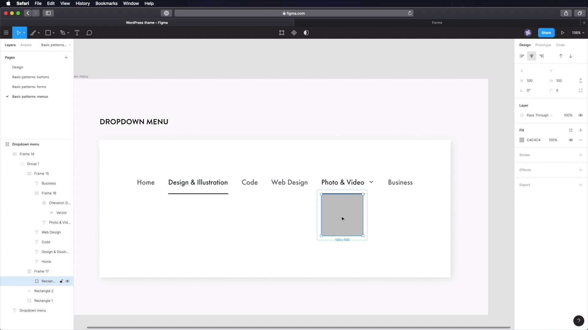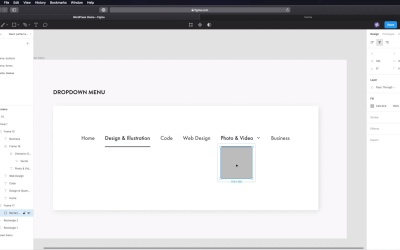 Welcome back to the course. In this lesson we'll be designing our navigation menus. And these are or represent another very popular pattern in UI design. And WordPress actually has a feature for quickly defining these menus. So having these in our design system is very important. Let's begin. We start in Figma, where we'll create a new page, called basic patterns menus. And let's quickly grab one of these frames. And let's do a drop down menu, this will be the main navigation menu. Let's start with a piece of text. This is home, we'll be using Futura medium, 18 pixels. And for the color let's go with something like a grey-80. Or grey-70. Paste that in. Okay, let's create a new frame for this, and let's add 003 to pixel spacing between items. So now, we can just do this as much as we want, so let's create the other menu items. Obviously these are just some placeholder items. And that should be enough. Cool. Now photo and video will actually be a drop down menu. So we're gonna put a little chevron arrow and I'm gonna use this Chevron down that I have from our icon set. And what I'm gonna do is group these two up. And create the frame with auto layout, and make sure I set 16 pixels of space in between the two. And actually, I think we need to go half that value, eight pixels. Let's also target the chevron down and change its size to 16 pixels. And make sure it's aligned in the middle and it's aligned in the middle. Perfect. And finally, let's change the color of the icon as well. Now we need to specify a style for hover, and active. So I'm gonna start by sampling our grey-100. So let's say that Design and Illustration is the active page. We're gonna give it a darker colour, and we're also going to add a small line underneath, like an indicator. So let's grab the rectangle tool. And let's have this as one group. So I can freely move this around. Like that, I'm gonna place this at eight pixels. And I'm gonna make it four, sorry. I meant to do this. And let's do two, for height, that should do the trick and also use the same color as before. Okay, let's move this further down a little bit to 16 pixels from the text. All right, it now looks pretty good. And finally, let's style the drop down menu. Let's duplicate this and put it under Photo and Video. Let's also change the color of this, and this will represent an active drop down menu. All right. Now below this, let's create a rectangle. And I'm actually going to make a frame out of it by adding outer layout. And for this frame, I'm gonna choose 24 pixels padding, top and bottom, and 16 pixels of distance between elements. And I'm going to add a drop shadow, 20 blur 4X, 4Y, black 10%, and let's put some text inside. And let's also add a fill color because the shadow wasn't showing up. There we go. For this text, we're going to change things up a little bit, we're gonna get a lighter color like a grey-70 And we're gonna use Book and 16 pixels for font size. Okay and this is a vertical frame, good. Let's duplicate these. And let's say we have some extra categories like editing, inspiration and I don't know, Adobe Premiere Pro. All right, now let's move this whole thing 24 pixels to the left, one, two, one, two, three, four. Okay, so now the text inside matches my text here. We're going to use orange-100. We're going to use orange-100. We're going to use orange-100. We're going to use orange-100. That's how our drop down menus should look like. And finally, we have to create a footer menu. So the menu under it goes, you guessed it, in the footer. This is much simpler. We don't have these, we don't- oops, no, I broke it. I don't have this. I don't have this, and we don't have this. Instead, we just have these items. And let's also use this color for all of them. Okay. And now, we'll select all. We'll change this to Futura PT Heavy. We'll essentially be using the over line Properties that we have here, so we're going to be using this style except a different color. So Futura PT Heavy, let's make this uppercase, and what else, we need a little bit of letter spacing, 5% should do the trick. And let's see what kind of spacing we have here. Let's ungroup this, and we have 32, let's go a bit lower, maybe like 24. And to get the hover state, let's exemplify using this link here, so when you hover on one of these links on the footer menu, the link changes its color to this. How cool is that? Okay. And those are the two menus that we'll be using, the drop down which is the main menu, it goes In the header, and a footer menu, which will find a place for it in the footer. All right, and that's it for this lesson. Our design system is really starting to take shape and that's fantastic, let's continue, in the next lesson, we'll cover icons and images, so see you there.