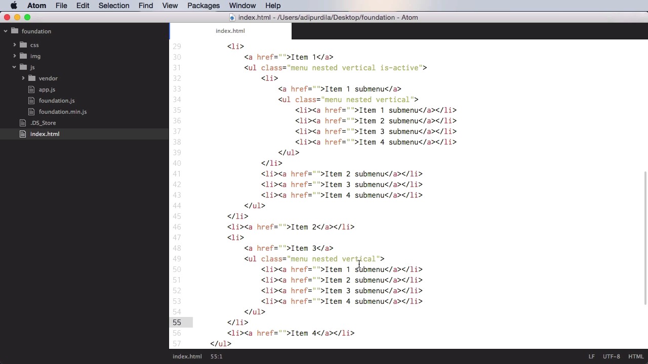 Let's have a look at the navigation components. And I say components, plural, because Foundation has a few basic ones t hat can be combined in order to form more complex ones. So, let's start with the most basic one, which is the menu. Creating a menu is actually very simple. You start with an ul, a class of menu, and let's add some list items with anchor text. This bit of code will generate this menu, now you have a several options for this menu. You can affect the item alignment by adding the class of align-right and now all of the items will be pushed to the right in reverse order. So we go from four to one and we can also create a vertical menu. So simply add the class of vertical, and now it's a vertical menu. This is very good for off canvas menus, or side bar menus, and stuff like that. You can also create nested menus. So, for example, if I were to copy this entire menu and paste it inside a list item. And just like this, and add the class of nested, we would create this bit. Now the menu component has three plugins or three modes, if you wanna call them that way. You can do drop down menus, you can do accordion menus, and you can do drill down menus. Now all of these three require JavaScript. So in order to make them work, make sure you have the JS installed for Foundation and inside app.js, make sure you are calling the foundation function, which initializes all of the JavaScript plugins. Now to create a drop down menu, let's start with this menu. We'll add the class of dropdown and in addition to that we'll add a data attribute, data-dropdown-menu. Now this will basically mark this menu as a drop down one. So now let's go ahead and actually create a submenu right here, and we're going to just give it the class of menu, and let's create an additional text here called submenu so we can differentiate between the two. So now we have the default menu, and then a sub menu. And of course, you can go even further. You can add this ul inside another list item here, and it's gonna create a sub menu. So you can go a couple of levels deep with this. Now, if you want, you can also make this entire menu into a vertical one. And it looks something like this. Although it doesn't look that good, yeah, you do have the option to do this. Now, the other type of menu is called drill down and it uses the standard menu syntax, all we have to change is the data attribute here. So instead of data dropdown menu, simply change to In data-drilldown, remove the dropdown from there and add nested and vertical to both of these submenus. All right, so now you have this. Notice the arrow is all the way out here, but if you click on the first item, it takes you to this bit. And you can go as many levels as you have in the menu and clicking on Back takes you to the parent element. Now the third type of menu is the accordion menu. And this only works of course on vertical menus. So a couple of things you need to do, ul class=menu vertical, or vertical menu, data-accordion-menu. And then let's say that you have yet another one on the third item here. Okay, so now, your menu looks something like this. Now let me just delete these first menus, so it's gonna be much clearer what's going on. Okay, so this is the first item. Click it and the menu is gonna collapse. Click it again and it's going to expand. Click this again and the submenu is gonna expand and clicking this will basically toggle it's submenu. So, this is an accordion menu. All right now, let's talk about some of the more complex components you can create around these menus. And the first one is a top bar. So with a top bar, let's actually start fresh here. With a top bar you start with a div, basically, with the class of top-bar. And then you have two components. You have a top bar left and a top bar right. So div with a class of top-bar-left+.top-bar-right. Now what you put in these is really up to you. For example, on the right side you could put a search or some contact information. And on the left side you can put a logo and maybe a navigation, a menu. So let's do a simple example on the left, let's do a drop down menu for example. We're going to start with an ul a class of menu and dropdown and inside let's put a list item. Let's say logo here, and then another list item where we're going to put an anchor tag. And that's gonna say Item 1, for example. And let's add a sub-item to this one. So we're do an ul.submenu.menu.vertical. And a couple of items there. And then maybe do another list item, we'll call this item, let's actually call this Item 2, and we'll call these Subitem 1, 2, and 3, and this Item 2. Now we do have to add a class to this list item has-submenu. This has to do with the styling inside the top bar. All right, and on the right hand side let's put just a simple text here that says Contact Information. This is just for demo purposes. Now, what you can do here is you can actually use a class called menu text, which styles the text differently inside the top bar. So let's do a span with a class of menu-text,and paste that in, and we'll do the same for the logo, so class=menu-text. All right, so now we have our top bar, but the problem is that we don't have the dropdown, so let's see, menu, dropdown. We forgot about the attribute data-dropdown-menu. All right, so there it is, the dropdown. Hover on it and it shows you. And then on the right side, you have the contact information. Now, when you resize this, the left and right sides of the top bar will actually stack on top of one another. Just like that. Now this span here doesn't have the correct sizing, so instead of span, let's use a simple div with a class of menu-text. And that's gonna fix the incorrect padding, and it's gonna position this in the middle of the top bar. Now, there is another component that can be used as a navigation, and that's called Magellan. And that allows you to create a navigation that will actually track the active section, the section that's in view, and it 