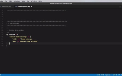 In this chapter, we're gonna create a more sophisticated theme options page, with multiple filed types, with more options for validation. We're gonna implement an image upload or so. There's gonna be quite a bit of work but we are gonna structure it, in an easy to understand way. Now, the very first thing we have to do is think about creating the sections and fields. We're gonna use the same setting that we used previously which is AP options. But in terms of sections, we're gonna have three of them. And in terms of fields where there gonna be a lot. And the way we did things in the previous lesson. Just using that function to manually register the section and fields. It was okay for a limited number of dates. But when you're dealing with, let's say 20 fields, right. That's not a good way to do that. It's not very efficient. So we need to find a better way, and that comes in a form of two multi dimensional arrays. And by using these along with some loops in PHP, we can create a far more efficient and elegant solution for registering these fields. So, I changed things up a little bit in functions PHP. I now include theme options.php file which is this. It's just a copy of what he had before. And what I'm gonna do is simply, select pretty much everything and delete it. So now we have nothing [LAUGH] right? We don't have an AP theme options page anymore. Now, in this lesson let's create the section and field definitions. First thing we're gonna do because this file will get quite large is create a table of contents. And the table of contents looks like this. We're gonna do our definitions, we're gonna implement the hooks, we're gonna write our render functions, our sanitize functions, custom scripts. And we have a section at the end for other functions. So now let's start with our definitions. Let's begin with Section Information. Now what exactly is the structure of a section? Well, it has a title and it can have a description. But instead of manually defining these sections, let's put them in a multi dimensional array. So we're gonna define a variable called ap_sections. That's gonna be equal to an array. And inside that we're gonna use the key value pair methods, so we're gonna have a key and then the value is gonna be another array. That's why this is called the multi dimensional array. Because we basically have an array inside of an array. And accessing a key from the main array, will actually give us instead of a string or a number, it's gonna give us another array. So, we're going to say the first key will be section-theme settings. That's going to be an array that has two other key value pairs. The first is gonna be for title and actually have a snippet here. So we're gonna say title. We'll call this theme settings. And then we're gonna have a description. That's gonna say General theme settings. And we don't need the comma there anymore. Right, so that is our first array item. And this is what's responsible or what will be responsible for creating the section with the ID of section theme settings. Now let's go ahead and add two more sections. We have a section for styling settings with these values and one for social settings with these values. Now let's go ahead and create field information. We're gonna define an array that's called ap fields. That's gonna be equal to the following. Just like the section array this is gonna be multi dimensional. We're gonna start with the first field, that's gonna be it a logo. And a logo will have multiple properties, right? You can have a title in our case, we'll just call it Default logo it can have a type, in my case it's upload. Now these types you can name them whatever you want, but we're gonna use them later on to decide what type of HTML we're gonna render on the page. Next, what else can it have? A section, right. We need the section to which this field belongs to. In our case, it's gonna be section theme settings. So, the first one here, we're getting this ID. What else? Let's do a default field, and this will give us a default value. Right now, we don't have anything. We need a description for it. We can name it desc, description, whatever you want. Finally, we're gonna do a sanitize property and this will have information of how this field will be sanitized. Again, we're going to use this later on to decide what type of validation or sanitization to apply to this particular field. And with this one field complete this time to add the other fields. So let me just go ahead and do that right now. So I just pasted in a bunch of field that I had already prepared just so I can save sometime, and now I'm gonna walk you through them. So we have logo alternate, that's also an upload type basically it's logo that you can use on. A different type of background, like a dark one. Then we have Google Analytics which is text. Notice we have a different keyword for sanitize. This will be used later on to apply different sanitization techniques or different validation techniques to the field. Then we have the search bar which is a check box It has an additional property as a label. And I just wanna make a quick note here with the risk of repeating myself. How you define these race is entirely up to you. You don't need to name this label or section or title. You can name them however you want and you can have as many properties or as many values in that array as you want. It's what you do with them afterwards that's important, right? So for example, label will be used to render a label HTML element. Next, we have a color scheme which is a radio button with two children in the form of one array, light and dark. Now we have a select font here with multiple children. Customs CSS which is text area. And then finally, we have social Twitter, Facebook, and Google plus as text values. So these are all the definitions that we need. Now we're gonna write some PHP loops, some functions and we're gonna register these sections and these fields. We'll do that in th