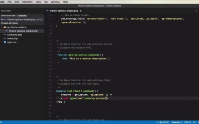 Displaying the fields is pretty straightforward, we just need to write the callback functions that we defined in the previous lesson. And do some minor tweaks to the ap_theme_options function that's responsible for rendering the entire page. Let's actually begin with that. So, I'm gonna go to the ap_theme_options. And in this function, I did tell you we were gonna come back to this. In here, I'm gonna say settings_fields, and I'm gonna pass in the name of the option, AP_options. An AP_options is this one here. Yeah, so it's basically the ID of our setting. We are basically saying with this function go ahead and render all the necessary code for the fields that belong to he AP_options setting. And then we have to create the sections. So, do_settings_sections and the page, we're gonna say, ap-theme-options. An ap-theme-options is this one defined right here when we created our theme page, and it's also present in the add_settings_section and add_settings_field functions. Already, you can see the connection here. The sections and fields are connected to a certain page. And by doing this we can actually create multiple theme options page with different sections and different fields. That's one thing you should keep in mind. All right so once we do this, let's do a quick refresh. You're gonna see that we have general settings so it's right here but we don't have a valid callback. This general_section_callback function. And we also don't have a valid call back in this test_field_1_callback function. So let's go ahead and write those two functions. First we're gonna write general_section_callback. This will be used for displaying the section HTML. We'll just say echo. This is a section description, like that. Save. And if we come back refresh. Yeah, you'll going to see that under general settings, we have a section description and we can use this method to add descriptions to our sections. Basically it's a very simple way to do that. Next, let's create our field. We're gonna create a function called a test field one callback which is exactly the name we used here and add_settings_field. In the inside were basically echo an input type text. Because that's the thing that we need right now. If we need a checkbox, we would render a checkbox or radio button or whatever we would need. So actually the first thing will do is do the following. We're going to define a variable called options and that's going to be equal to get option and we're going to pass in AP options. So what does this do? Well it's using the get option function to query the database and get the value of the ap options setting. Remember, this is our general setting. It's where all of our options will be stored. So, we're getting this into the options variable. And then, we just close the PHP tag here and I'm going to open it again here because I'm going to write some HTML, I'm going to say input, type text the name is going to be, and this important, AP options. So the name of our setting, and then in square brackets, AP test field one. So why exactly did I do that? Well, AP options is the name of the setting. AP test field one is the unique identifier or the ID of our field. So by doing this, we're basically saying that ap-test-field-1 should be serialized, and placed inside ap_options. In other words, ap-test-field-1 belongs in the ap_options setting. We're simply gonna add a value here, and we're gonna say PHP echo options and inside options we're gonna pass in ap-test-field-1. And then we're gonna close the PHP tag here. Okay so what is exactly does this do well. It will print the option found in the database for this field. If we saved a value in that fields it's gonna be saved to database and then we can retrieve it by using the get option function. So, get option because we're using a serialized value, get option will be an array. And we can access values or portions of that array by using certain keys like for example ap test field one. So let's actually give this a go and see if it works. So I'm gonna refresh. You're gonna see a field here. But one thing that I forgot to add is a submit button. So right here in my form I'm simply gonna use the submit button function that exist in WordPress and I'm gonna use it with the default parameters. This will print a save changes button that's gonna save whatever value I have in this field that's gonna take it to the database. So test field one, let's say hello. Save changes, and now if I refresh the page that hello value has been saved to the database and it has been brought back by this get option function. And it was set as a value for my input type text. Now, let's have a look in the database and I'm simply gonna hit browse again. We're gonna scroll all the way to the bottom and you'll see the option name AP options. Yeah this is the setting that we registered. And this is Its value. So, if for example I work to do, let say right here. Just bear with me with this. If I'm gonna say print_r options and I save, notice what the value of options is. It's in array, yeah. It's an associative array basically comprised of key value pairs. This is the key, and this is the value. And this is how all of the options are saved in database in this one setting. And that's happening, and I reiterate this, because we set the name to this value when we created our input. So I hope that made sense. When I first learned about these things, it took me a while to get my head around them. But, ultimately, they're pretty simple. Now, the fields are displayed. So there is just one last step. Sanitizing that input. And we're going to do that in the next lesson