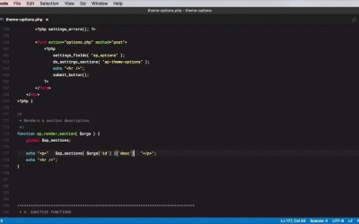 Registering our sections and display fields in this version of the page is a bit more complicated. Because we are trying to make everything more efficient by introducing those two multidimensional arrays, we need to run some loops to repeatedly register sections and fields. So let's do that right now, and we're gonna start in the HOOKS section here. We're gonna add another action and this time we're gonna tap into admin_init. And we're gonna add our own function called ap_init_settings. Again, the rest of the arguments are not required. So now we're gonna go to our other functions section here. And we're gonna write a function that registers and adds settings, sections, and fields. All right, function ap_init_settings. So the same one that we set in our hook here. Now, in order to use these two multi-dimensional arrays, ap_ sections and ap_fields inside a function, we need to make them available. To do that, we're gonna use the keyword global $ap_fields and $ap_sections. That means we can now use these to reference those two-dimensional arrays. All right, so the first thing we have to do is, just like last time, register a general setting, and this will hold all of our options that are serialised. So we're gonna say register_setting, ap_options on both of these fields and ap_options_validation as a validation call back function for the setting, this is exactly the same as in the previous page. Now, what's different is how we are gonna add sections and fields. So, let's start with sections. We're gonna say add sections as defined in the $ap_sections array. We're gonna use a loop, more specifically a foreach loop. So we're gonna say foreach, the variable is $ap_sections, so this is where we look as, we'll call this $section_id and $section_value, right? So what we're saying is, take $ap_sections, take that array and go through each of its elements and grab the first or the key as $section_id and the value as $section_value. So, for example, on the first element of the array, the section_id will be section-theme settings and the section_value will be this array. I hope that make sense. And with this, we have to do the following, add_settings_section, so just like last time but this time, we're gonna use these variables. We're gonna use $section_id, we're gonna use $section_value of title, so for the title of this section, we're gonna use, yeah, the $section_value, which is this array, and we're gonna grab the title key. Then the callback function used to render this in HTML is going to be called ap_render_section and finally, the page will be called ap-theme-options, right? So that's gonna go through all of our sections or it's gonna go through all of the items in our array and it's gonna generate sections based on what we wrote there. It's a much simpler approach rather than writing or registering those three sections by hand. Let's do a quick refresh, see if we have any errors. Okay, that's good, so the only error we have is the fact that ap_render_section is not yet defined. But as we can see, Theme Settings, Styling Settings, Social Settings, all three of our sections are now being displayed. Great. Next, let's go ahead and define the fields. Add fields as defined in the $ap_fields array. It's very similar to what we did before. We'll do a foreach, the variable this time will be $ap_fields, and the key, we'll call it $field_id, and the value will be called $field_value. And inside, we're gonna say add_settings_field for the id or we'll use the $field _id. For the title we're gonna use $field_value, title. The call back function is gonna be ap_render_field. The page is gonna be ap-theme-options, next, we are going to pass in the section of the field. So we're going to say $field_value, section. And finally, we can pass in an argument to the render function or the call back function. In this case its going to be the $field_id, and you're going to see why in just a little bit. Okay, so now if we do a refresh. Yeah, you're going to see all our fields in their correct sections. So we have the logos here, Google Analytics, Search Bar, Color Scheme, Font Pair, Custom CSS. And the three social profile under social settings. Now of course we do not have the ap_render_section or render_field functions yet. So let's go ahead and write those next. Because those are render functions, I'm gonna write them right here. So function ap_ render_section we're gonna declare a global $ap_section, so we have access to that array. And what we're gonna do is we're gonna echo a paragraph, oops, and we're gonna grab the the description for each section. So, how are we going to do that? Well, $ap_sections looks like this. So, what we need is this value here. Now the ap_render_section function can receive some optional arguments. And those arguments among others contain the id of that section. So we're gonna do the following $ap_sections of $args of id and we're also gonna get the description here. And just bear with me, I will explain in just a little bit. Closing the paragraph there. And we're also gonna echo a separator. Okay, now let's see if it works, first. All right, it does tell us that illegal string offset on line 177, which is here. Hm. Okay, so let's see. Did I not write this correctly? $ap_sections, sorry, this is actually meant to go outside like this. So, refresh, okay. So, now we have the proper descriptions for our sections. So, this is how it works. We're using the args or the arguments we receive to get the id of the section that needs rendering, right? So this right here, for example, gets replaced by this, and this is the id. So then what we're doing is we're saying $ap_sections of that id, which gives us, This bit, and from this bit we're getting the description which were done displaying in a paragraph. I hope that makes sense. Next, let's go ahead and render fields. Now, the ap_render_field function receives this $id as a parameter, and this id is the same id that I passed in here. This is t