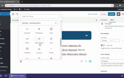 Hello and welcome back, in this lesson I want to introduce you to a plugin called Stackable. And you can find it in your New Plugins section by searching for Stackable Gutenberg Blocks and it's by Gambit Technologies. Once you've got it installed you'll see a Stackable option on your menu, which really doesn't have any options, or settings, or anything like that. It's just kind of a summary of how to use it, but if you know how to use blocks you can figure out how to use these. So let's go to our Posts and let's go and add a new post. And so we'll give this a title and then let's take a look at our Stackable blocks. So if we add a new block you'll notice that there is a separate section for, let's go up to the top and add it from here, we can see everything a little bit better. But we now have an option or a section for Stackable Gutenberg Blocks and we can expand that out to see all of the items that are available to us. So, obviously, we don't have time to go through all of these, but I do wanna highlight a few of these for you. So let's start with the Accordion, the very first item here on the list, and that's exactly what it sounds like, it gives you collapsible content. So let's just call this this Item 1 and then you can put whatever content you want in here. So I'm just gonna paste some content there and let's get rid of this extra white space, there we go. And you'll see there's not an option to add another one here. But if we just click Add Block and then add another Accordion, it'll add it right below it and we can do the same thing here. So let's just click outside of that one and let's see what this looks like if we were to publish it so let's Publish that. And then we'll View the post and when it loads you'll see we have these two items. And if we click on one of them it expands out, if we click on the other one you'll notice the bottom one expands out as well. Now, these are not grouped together so the top ones are not going to collapse whenever the bottom one is expanded, but it's still a pretty solid feature. Also, if we click on one of these items while we're editing it and then let's go to our Options over here on the right, you'll see there are some options for changing the heading. So we could change the background color of our heading and the text color of our heading if we wanted to change the look of that a little bit. We can also choose whether we want that to open up at the start so if we want it to be opened up whenever the window first loads we just turn that on. So that's the Accordion option. I'm gonna get rid of this second one, we don't need two on there for the purposes of our example here so if I can, there we go, Remove Block. Okay, lets add another one, we’re gonna go back into our Stackable section here. And I’m gonna scroll down a little bit and we’re gonna take a look at this Pricing box feature. So you'll see by default it sets up two columns for us. And it gives us a very typical pricing display that you might see on a website where you're selling different options for a product. So we might have the Basic option on the left and then the Premium option on the right and we could change the value of the Premium option. So, obviously, any of this text is editable and you can also update the number of columns you're using. So we could bring that up to three columns and there's another column that shows up over here on the right. If we close our options here, actually I think it sticks it down at the bottom because we're using such a small resolution on our monitor here. But if we were to update the page. And then view the post in a full-width browser and that's still just taking up two columns at a time there and that's probably a limitation of this particular theme. This theme has a maximum width on it, which doesn't allow it to get wide enough to put that third column there. But it is nice to know that it does break down really nicely so that if it goes down to a second row it's gonna take up the full width. So that looks good. So let's close that, and let's click back inside one of these items here, and open up our options again, our settings. I'll just bring that back down to just two columns. And we have the usual color options here, we have the Pricing Title colors so we could change that, that's gonna be the text above the price. The price itself we could customize it if we wanted to. And so on so this is fully customizable as far as the colors are concerned. We have button settings as well, we can change the design of the button, right now the basic button set up is selected. We can change it to Ghost and that will give it a white background with an outline. We can change it to Plain Text or a Link, which is just very similar to the Plain Text. I'm gonna go back to the Ghost setting, I like the way that one looks. We can also update the size of the button so we could do a small, medium, large. We can change the border radius of those buttons to round them off a little bit more, and so on, and so forth. So it's another really nice feature there, obviously, it's a very specific use case for that feature, but it's there if you need it. As always, since we don't have time to cover all of these options, I would encourage you to go through that Stackable section here. And take a look at each one of these options and see what it offers. Because there's some really cool items here that give you a lot of options when you're laying out your content. So thank you for watching and I'll see you in the next lesson.
