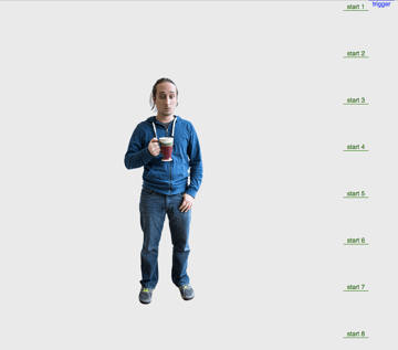 Since there are 9 frames, we loop through that number of iterations whilst defining the same panel for a triggerElement. On each iteration of the loop we multiply that loop’s value by the offset amount (1 * 100, 2 * 100, 3 * 100…). We also define a class to toggle through; .frame1, .frame2, .frame3 and so on. Each of the classes represents the background position of each image within the sprite.