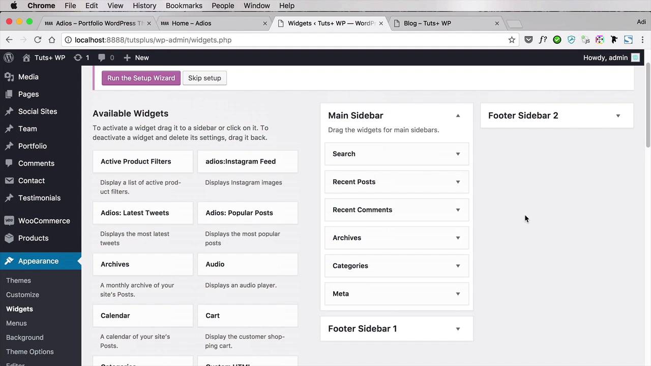 The next page on our to-do list is the blog page. There are a couple of options to customize it so, let's have a look. So, well I'll go to our Blog page right here. And this is currently what it looks like. Now, to start things off, I want to get rid of this title here, that's very easily done. We'll go to edit pages, Blog, and if you remember from the previous lesson, all I have to do is blank the Title Wrapper > Subtitle field here. So, when I make that blank, we're gonna hit Update and now that title is gone. Also, I would like to add a sidebar. So, to add a sidebar, we're gonna scroll down to the options, Sidebar. And I'm gonna select a layout. One column is the current layout, which doesn't show a sidebar. But, I have the option to display it either on the left or on the right. So I'm gonna choose columns right and I'm gonna select the default sidebar. So I'm gonna hit Update. And I'll do a refresh, and you'll notice now we have a sidebar on the right side. And on the left, of course, we have the list of posts displayed in a masonry format. Now, if you want to edit the sidebar, and just in case you're not very familiar with WordPress, you will need to go to Appearance > Widgets. And in here, you'll find all the sidebar locations that are defined for this particular theme. Here we have three locations, a Main Sidebar, a Footer Sidebar 1 and a Footer Sidebar 2. And the widgets that you see here are actually the ones being displayed on the right side here. So if, for example, I want to get rid of the meta, I would simply delete that. And I will do a refresh, and now that is gone. Maybe I just want to display the search, right? So, I'm gonna delete the rest of the widgets. And maybe grab one of the custom widgets made by the authors of Adios, like for example, the latest tweets, and those might come in handy. And I can say follow me on Twitter, and I'm gonna put my Twitter username here. Save that and then refresh. And now we have a brand new sidebar. And that's it for the blog, really. Of course you would go and have your own posts. I didn't in this case because it's just demo. But having you post is really simple. You just go to Posts > Add New. The theme offers four different formats, Standard, Video, Gallery and Audio. So you would enter the title, you would choose the post format, the categories. Set a featured image maybe, and you're all set. Now, we're almost done customizing our portfolio site. The last thing we need to do is tackle the contact page. So that's coming up in the next lesson.