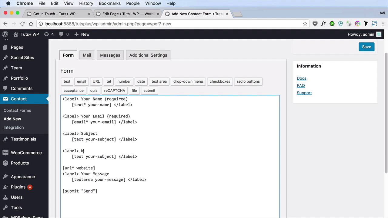 The final page that needs customizing is the contact page. So let's begin by having a look at its current state. I'll go to Get In Touch, and we can see that we have two sections, basically. We have a contact form, and we have an address. Now since this is a portfolio, and I do not have a physical business address, I'm gonna remove this section, and I'm gonna add my own contact form right here. So let's go back to our pages, Get in Touch. And the first thing I'm gonna do is remove this entire row. Let's delete that, let's hit Update, and have a look. There we go. And let's see about creating a new contact form. Now for most cases, the one that you see here is more than enough, but I just want to go through the process of adding a different form, so you can see how it's done. So the theme uses a plugin called Contact Form 7 that handles all of our forms. And currently, if we click on Edit, we're gonna see that it uses the Adios Form, and we can also give this search a title. Now, if we go to Contact, this is where all of the contact forms reside. So if we click on Adios Form, now we're gonna see a simplified version of the form from the front-end. And for each form, you have access to its main structure, to the email address that the form contents will be sent to, and all sorts of meta information, like From, Subject, Additional Headers, and the Message Body. You can edit all of these here, and Contact Form 7 will configure everything automatically, it's really, really fast. You also have access to the messages that will be displayed in various situations, for example when the sender message was sent successfully, we can display this. Of course, all of these are editable. When the message failed to send, when the validation error occurred, and so on, you have access to all of these, you can customize them as you wish. So let's add our own form. Let's go to Add New, let's say Tutsplus Form. Here we can see a default structure for our form, we have name, email, subject and message. Maybe I want to add, just for the sake of it, a URL, right? Just here. So I'm gonna say URL, and this is, let's say it's a required field. Let's say the name is website, no default value, and you can set an additional id or Class attribute. So I'm gonna insert that tag, but also I'm gonna wrap it in a label, just like we can see right here. So I'm actually going to copy this, paste that in. And I'm gonna say, Website. I'm gonna copy this bit, and I replace this short code with my URL short code, and I'm gonna hit Save. Of course, go through Mail, Messages, or additional settings to customize this form to your liking. So now I'm gonna go back to my Get In Touch page, I'm gonna do a quick refresh, and I'm gonna edit this section and I'm gonna choose Tutsplus form, Save changes, Update. And now if we go back to the front end, now I don't see any border around those inputs, so we need to add a special class called input field, and that's defined in the actual theme. So we'll go back to the theme, and we're gonna add the class right here at the end, we're gonna say class input-field. So let's go ahead and copy that, we're gonna paste that everywhere, on the website and on the message. Let's go ahead and save that, all right. So now we have good looking inputs on all of these. Now if you want your form to look like the previous or the default one that you saw, you simply remove the label and use a place holder, instead. But in my case, I think this will be just fine. Also i do know that the send button has a special class, although I cannot remember it right now. So I'm gonna refer back to the original Adios form. And let's see, Submit, it has a class of input-send and also a class of submit. So let's actually copy these. I'm gonna paste those in. And something else that I saw here is the response. This is an element that will be used to display the response, or the form response in case something goes wrong, or any kind of notification, basically. So I'm gonna save that, refresh, and there it is, Send. You probably can align this to the left, you just have to search the Contact Form 7 documentation or the theme documentation, and see what classes it can use for that. But now if we hit Send, it's gonna show up the response here and also these error messages, telling us that we did not complete a required field. Now, of course, for your own project, you would need to customize this a bit further, add your own email address, customize how the emails are being sent, their structure, also the meta information, all of that stuff. But from a technical point of view, this is how you would add a new form for contact and customize the contact page. Now with that, our portfolio website is pretty much complete. You saw just how easy that was, right? As long as you're using the right tools, this becomes a very easy task. This was the final lesson of the course. Please join me in the next video for the conclusion.