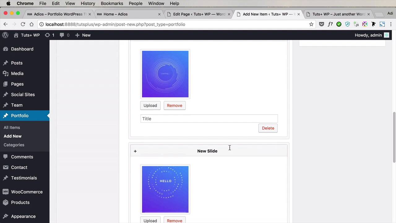 Our portfolio home page is not ready just yet. We still have four sections to deal with. So let's start customizing the section that's right below our main slider. And this is what I'm talking about right here. So we're gonna go back to the main page. In the back end, of course. And here we can see the four columns of content represented by these columns in the front end. So the first thing I'm gonna do is get rid of this fourth column, because I don't want that. Instead, we're gonna focus on three columns. So I'm gonna delete that image block right there. And then I'm gonna hover this custom text here. I'm gonna select the number of columns that I want. And in my case, I want three columns of equal size. So I'm gonna hit that. Let's hit Update. Now if we refresh. And we're gonna see the updated layout. Awesome. Now going back. I'm gonna edit this text block and instead of bonjour, I'm gonna simply say, Hello. And I'm gonna edit this text block, and instead of this text, and I'm gonna use this text. Now I wanna link my portfolio to the portfolio page, so I'm simply gonna hit this. And I do a search my work and it finds the page automatically. I'm gonna apply that. And then get in touch, I'm gonna create a link to the contact page, which is this. All right, perfect. Save changes there as well. And then for this third section I'm gonna edit. And I'm gonna paste a quote by Steve Jobs that I really, really like. So I'm gonna hit Blockquote. And the quote says, Design is not just what it looks like and feels like. Design is how it works. Really nice quote there from Steve Jobs. And, let's see. I'm gonna edit this manually because I want to add a site. Yeah, let's save changes, let's update the page. I think I want a little bit more space here. For some reason it doesn't give me the space that I need. I try it in visual mode, save changes, update, and there we go. All right, and that's how this about section, or the hello section, should look like. Now let's move on to the case study, and this will be used for the portfolio mostly. As you can see from the demo here, the case study basically displays a list of portfolio entries and also filtering. So I'm gonna go back here to Latest Works. I'm gonna hit this edit button. I can choose the style. I can choose to show the heading if that's what I want. So I'm gonna simply say, Portfolio. And here I can edit the categories that I wanna bring portfolio posts from. So from now I'm gonna save the changes. I'm gonna hit update. And we're gonna go ahead and create some portfolio entries. All right, currently it grabs all of the categories that I have in the portfolio, but maybe I don't want that. So let's see, let's open the portfolio here. And these are all of the projects for the portfolio, but I think I'm gonna add some of my own. So Add New. We're gonna enter the title. And for the title, I'm actually gonna start with these, like for example Winter landscape. Yeah, this should be categorized as photography. And I can choose to add or to create a gallery for it, if that's what I want. But because this is about photography, I think I'm just gonna set it to a Lightbox, so the image will open in a Lightbox. And the only image that I'm gonna add is this. And also, I'm gonna set it as a featured image. That's very important. If you don't set it as a featured image, it will not show up in the portfolio. So I'm gonna publish that. And then we're gonna go back to our page and right here, for Latest Works, I'm gonna choose the categories that I want, photography to start with. And then we go back here and we scroll down to the portfolio, we're gonna see all of the posts from the photography category. If I decide to add another category, let's add a new portfolio item, for example, for mobile design. All right, let's say Demo mobile app. And we're gonna choose Add New Category. I'm gonna call it Mobile Design. And let's create a slide show for this. So I'm gonna select this. As one slide, I can give it a title if that's what I want. And then I'm gonna add another slide, maybe this. And yet another slide, maybe this. Let's actually give these a title. Let's say Slide 1. Again, this is just for demo purposes, Slide 2, and Slide 3. All right, so this will link to a single portfolio page. And also, I'm gonna set a featured image. Let's say this, for example. All right, let's publish that and then we're gonna go back. To our main page here. And we're gonna do a quick refresh. And in the Latest Works, I'm simply going to add another category here, Mobile Design, and I'm gonna save changes. So hit Update, and now if I do a refresh, you'll see that the portfolio displays the items from mobile design and photography. And I can filter these. Like this. And of course, if I click on this image, which I set to open in a Lightbox, it's just gonna open in a Lightbox. If I click this image it's gonna open in a single portfolio page. And right here, you can actually see the slider for that portfolio item. And right here, it's the title that we set previously. So this section is pretty much done. Let's move on to the blog stories. For the blog stories, we have a couple of blog posts that were added as part of the demo content. So let's go back to my main page, scroll down. Where it says Blog News. Or actually, instead of stories here, I'm gonna say, From the blog. Save changes. For the blog news, I'm gonna select the categories that I want to display posts from. In my case, let's say for example, from design. We have a couple more options here like how to order these, or how many posts per page do we want. But I'm gonna stick with the defaults. And for the Twitter stream, I'm gonna to enter my own username here. Hit Update. So now we go from this section to this section, which has a different title. It displays blog entries from my chosen category, and also displays my own personal Twitter stream. Finally, lets turn our attention to the footer. Now the footer can be controlled 