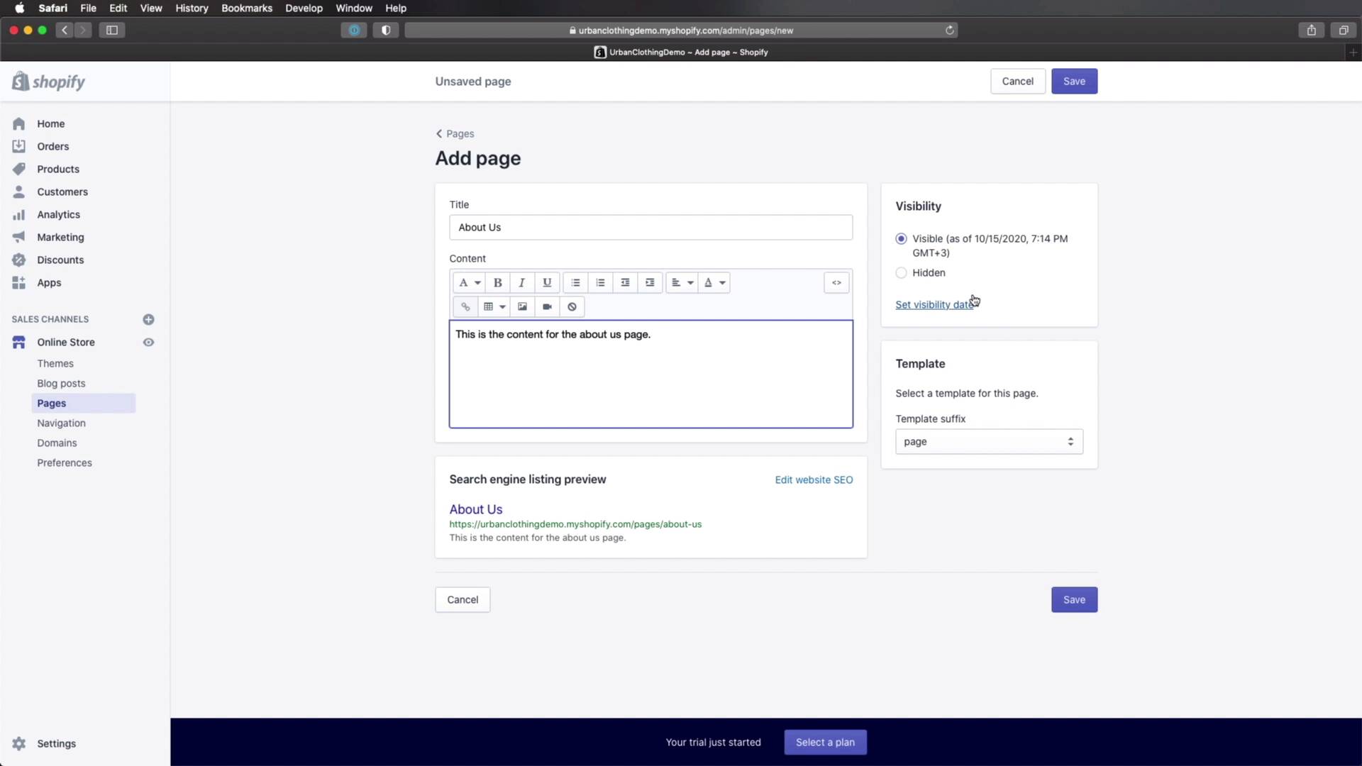 Welcome back to the course. In this lesson, we'll add two additional pages to our online store, a contact page and an about page, so let's begin. Adding pages is very, very simple. Once you're in the admin interface, click on Online Store pages and then Add page. Let's create the about page right now about us here. You can add the content and that content is gonna show up on the front end. So just to give you an idea, I'm gonna say this is the content for the about us page. Now, I specifically added this demo content because once we add our theme this will be hidden and it's all down to what template you're using for the page. And the currently active theme, we have two templates we can choose from, we have a simple page and a page contact. Now, the simple page will most likely display this content that I wrote right here. However, when we're gonna switch our theme, we're gonna have a lot more templates to choose from, and you'll see that some of those templates don't even display the content you write here. Instead, you can use a visual builder to edit your content. But more about that in a future lesson for now, I'm gonna set the title, this content. I'm not gonna bother with the template right now and the visibility we can set this up as visible right now. And once we're done, hit save. Next, let's create another page. This will be for contact us for content. I'm just going to enter the same demo content or a similar content as the previous page. Also visible, also the template. I'm just gonna leave it on default and click Save. So now if we go back to our pages, we can see the two let's call them additional pages that we created. Because we're using Shopify the rest of the pages that you expect from an e-commerce website are already created like the homepage, a product page, collection page, cart, and so on and so forth. These are just two additional ones We needed for this project. All right, so with the pages added, we're pretty much good to go in terms of content. But what about presentation? Currently, we're using the default theme provided by Shopify, but that doesn't really cut it for us. I actually didn't even show you. Let me do that right now. If we move back here in the admin interface we have this eye icon and when we click on this it's gonna show us a preview of our front end or our actual store. And as you can see, this is the default theme, and I personally don't like this very much. We're gonna be using a new theme and we'll do that in the next lesson. So I'll see you there.