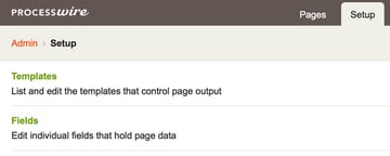 The settings page in the PW admin allows administrator users to alter fields and templates. As eluded to, “fields” are containers for content and “templates” allow you to add fields and permissions to pages. For example you may have a “homepage” template that has different content fields than the basic-page template used on all other pages on your site.