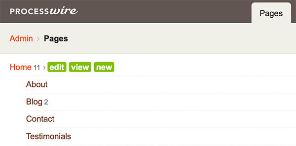 The first page you will see is the Pages section or Page Tree. From here you can view all the pages in your PW installation, and by clicking on a page title it’ll display any child pages and enable you to edit the content. The Page Tree is your portal to find, move, or delete pages, along with accessing page content.