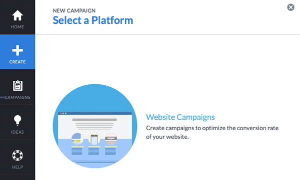 Now that you have VWO integrated with your site you can setup a new campaign. Click the big + icon in the left menu, then select Website Campaigns.