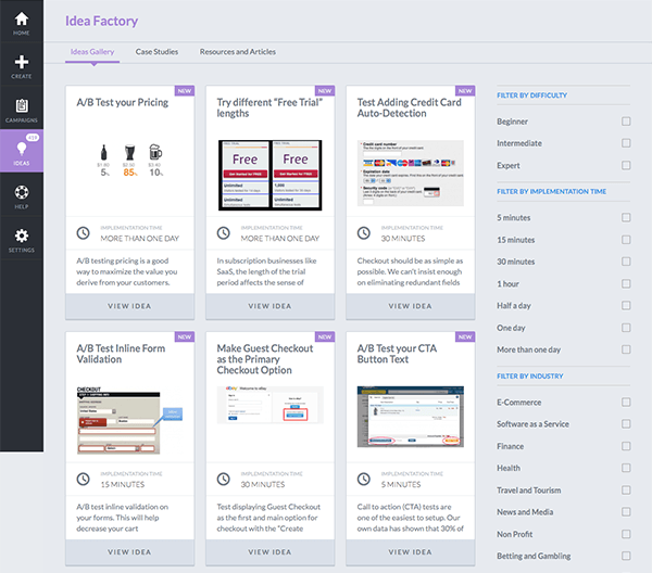 Another aspect of membership that is, in my opinion, worth the price of admission unto itself is the "Idea Factory". Once you've tested the obvious things like headlines and button colors you might be wondering what you can do next to continue optimizing. At that point, you can hit the "Ideas" tab in VWO to get full details and guidance on over 400 extra ways you can continue to make improvements: