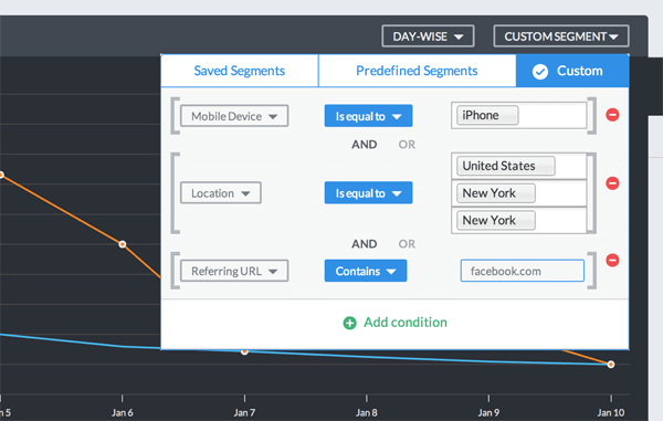 For example, you might use VWO's segment tracking system to discover that people on iPhones in New York coming via Facebook are the most responsive and yield the most conversions. You can then create a customized version of the site just for this segment, analyzing and tweaking it for usability and conversions until you get the most perfectly optimized variation possible.