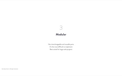 Welcome to lesson number three, where you learn about the different types of design systems. And different types work best for different people and different companies and different products. There is no one-stop solution for this. A design system should be tailored to a specific team, company, product, whatever it is. You can't simply borrow a design system from somewhere else and use it in your own product, it doesn't work like that. It needs to be custom made specifically for your project. I wanna mention that most of these types are based on Alla Kholmatova's book called Design Systems. So have a look there, it's a great book on the subject. The first type is strict. As the name suggests, flexibility is not key here. Instead, there is extensive documentation and the standards must be followed to the letter for a precise synchronization between designers and developers. This type of system must also cover a lot of ground because it must support a variety of scenarios. The second type is loose. This is more flexible than the strict one, and your team members can use it as a guideline, mostly, or simply not use it at all. This allows for more experimentation, but you have to be careful because a design system that rigid enough is kind of pointless. If people don't use it and don't stick to standards, there's no point to having a system. You need to find the right balance. The third type is modular. This is made from interchangeable and reasonable parts. Of course, any design system should have reusable parts. But for this one in particular, making components work well together while being independent is much harder. That's why this is the most difficult system to implement. And it's mostly suited for large products, for example, ecommerce websites. Now apart from how a system is built, we also need to look at how a team builds that system. And there are a couple of different ways to do that as well. What I'm about to tell you now is based on this article by Nathan Curtis. And I recommend you read everything he wrote about design systems. In a nutshell, there are three models teams can follow to create and sustain a design system. Solitary, centralized and federated. Solitary is when one team shares their system with another team. Not a great option, because as I was saying earlier, a system must be tailored to the specific needs of the team or the company. So using another team's system might be okay to begin with, but it won't work in the long run. Centralized means a team is in charge of the system and continues to grow it. Their purpose is to facilitate the work of other teams. In this type of model, the team in charge doesn't actually do any design work, but they do work closely with the designers. Finally, teams based on the federated model have a very talented group of people in charge of the system. These people make all the decisions and they convey those decisions to the other teams. These people are also fulfilling their original roles in the company. So there you have it, we looked at a few different types of design systems and a few ways or models that teams can use to build design systems. Now, how do you actually build a design system, where do you start? Well, we'll discover that in the next chapter. And the first lesson on the topic is going to be about design tokens and principles. That's coming up next.