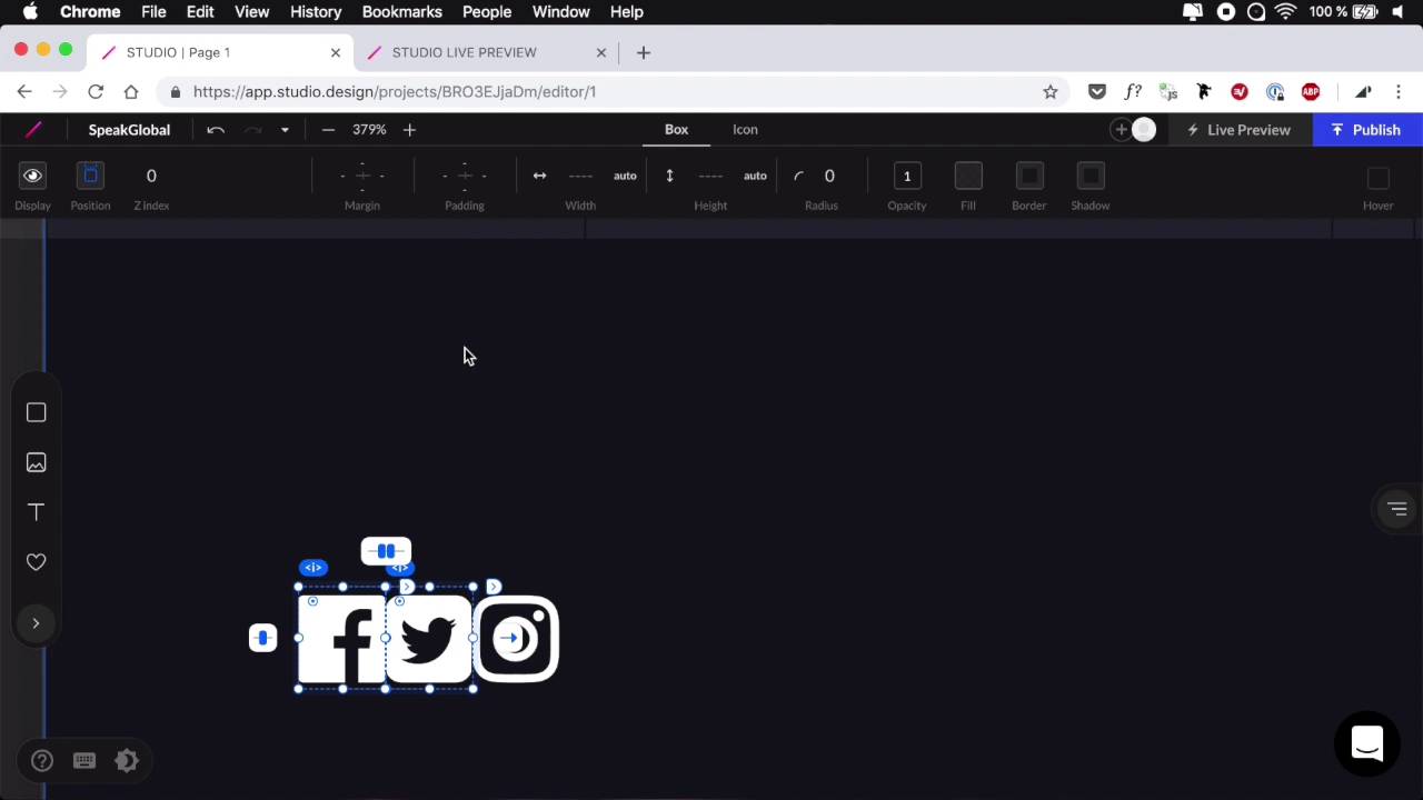 All right, so now that we're more familiar with Studio and Interface and the tools, let's go ahead and create a simple web page for a fictional piece of software. And in fact it's gonna be a simple coming soon page with just a little bit of information, a form for capturing some email addresses. And that's about it. So we're back here in the Studio dashboard. I'm gonna go ahead and create a new project. As you can see here, we can start over with a black canvas or we can choose from one of the predefined templates. But in our case, we're gonna start with a blank canvas. We're gonna name this project, SpeakGlobal. So first thing's first, I'm gonna upload a logo. It's just a dummy logo that I had laying around. It looks like this. And let's have a background color for our page. I'm gonna go to Fill. I can access some colors by clicking this icon, and there are some predefined colors right here. So let's go with maybe this indigo blue, and now I can tailor this to my needs. So gonna go something like this maybe. Okay, now let's bring in our logo. So simply a matter of drag and drop. Let's position this to the left, and here we have the option to use a box or an image. The box will essentially have the image as a background image. The image, if I set it to img here, it's simply gonna be an image tag. And then I can go ahead and resize it to maybe 120 pixels. Next I'm gonna select my page here and I'm gonna add a padding on all four corners for about 60 pixels. Next, let's add some text. We're gonna create a subheading. And for fonts, we're gonna use PT Sans, again from Google, and I'm gonna use the bold version. It's gonna be 13 pixels. Color, let's set it to white for now so we can see what we're doing. We're gonna align this to the left and I'm gonna set a letter spacing of 1 pixel. And then for the text itself, I'm gonna say the ultimate email marketing platform for, and then I'm gonna have a bigger title. So text again, also my left color white. For font, let's use this one, Lato, and let's make something like this. 48 pixels should do just fine. For line height, I'm gonna select 1.2 right from the get go and from this 1.5, In here I'm gonna type Creators & Entrepreneurs. All right, let's add a little bit of a margin here. I'm gonna add a margin button to all the elements, okay? And here, I'm actually gonna decrease the opacity to a white, let's say 40%. That should do it. And I'm gonna click this little button to add this as a document color so I can reuse it later on. Next I'm gonna group these up, and I'm gonna make sure that everything is aligned properly to the left. And then on the actual page I'm gonna make sure that everything is aligned to the left. And vertically I'm gonna position these like so. So we have logo on the top. This is gonna be in the middle because I'm gonna add a footer. Text, something that says copyright 2019, SpeakGlobal, all rights are reserved. All right, so this will be PT Sans, 16 pixels. Color is going to be the same white, 50%. All right, and also let's make sure this is aligned to the left. Okay, so now if we resize this page, and if I zoom out a little bit, you'll see how our layout is taking shape. We have a logo on top and this is in the middle no matter the size, and this is sitting right at the bottom. Let's generate a live preview link just so we can keep an eye on it on on a larger browser window. And you'll see that as we start making changes, you'll see them reflected here in real time. Next, let's add another bit of text here, so a paragraph right there. PT Sans 16, align left. Color's gonna be white. And we're going to say something like, we're launching very soon. Enter your email address below to be the first one to know. All right, now this and this we're gonna treat as a separate group, and I wanna make sure I add a proper margin bottom. Let's say about 60 pixels should do just fine, okay? And then under this I'm gonna add a form. So I'm gonna add an inline form. Just like that, oops, that didn't work. Let's try it again. There we go. And for this form, I'm gonna get rid of the initial padding. I'm gonna get rid of this label. For this button, we're gonna use a different color, something like, Something like this maybe or maybe something like this like a brick red. I'm gonna change the text here to Notify Me, there we go, and let's select this bit, and let's add a border radius of about 6 pixels. All right, now let's select the text. Let's add a margin bottom to this. 15 pixels should do just fine. And select these two, group them together. Make sure everything is aligned properly. And this piece of text I wanna resize to match my form. And then I'm also gonna set a line height of 1.5. All right, so let's take a look at the preview. That actually looks pretty good. So what else can we do here? Well, we can add a hover state on the bottom, on the button, and that's really easy to do. So I'm gonna select this background and I'm gonna check Hover. And then I'm gonna changes its fill to, I don't know, something a little bit darker ,like this. And now you'll see that we have a nice hover effect. Finally what I'm gonna do is add some social media icons right here. So for that, we're gonna go to Icons Font Awesome, and I'm gonna search for let's say Facebook. Let's grab this one. For now I'm just gonna position them all right here. I'm gonna set the size, 24 is good, and let's grab another one. Let's say, Twitter, I'm gonna put it there. Also color white and, finally, let's choose, what, Instagram? Yeah, that looks pretty good. And I'm gonna place it there, again, color white. So now I'm gonna take these three, and let me zoom in here a little bit. And I'm gonna select Twitter and Facebook. And I'm gonna go to Box and I'm gonna add a margin right of, let's say, 30 pixels, oops. Apparently, I did not have that one selected, 30, just like that. All right, so let's zoom back out and I wanna position these icons on the right side of my page. But the
